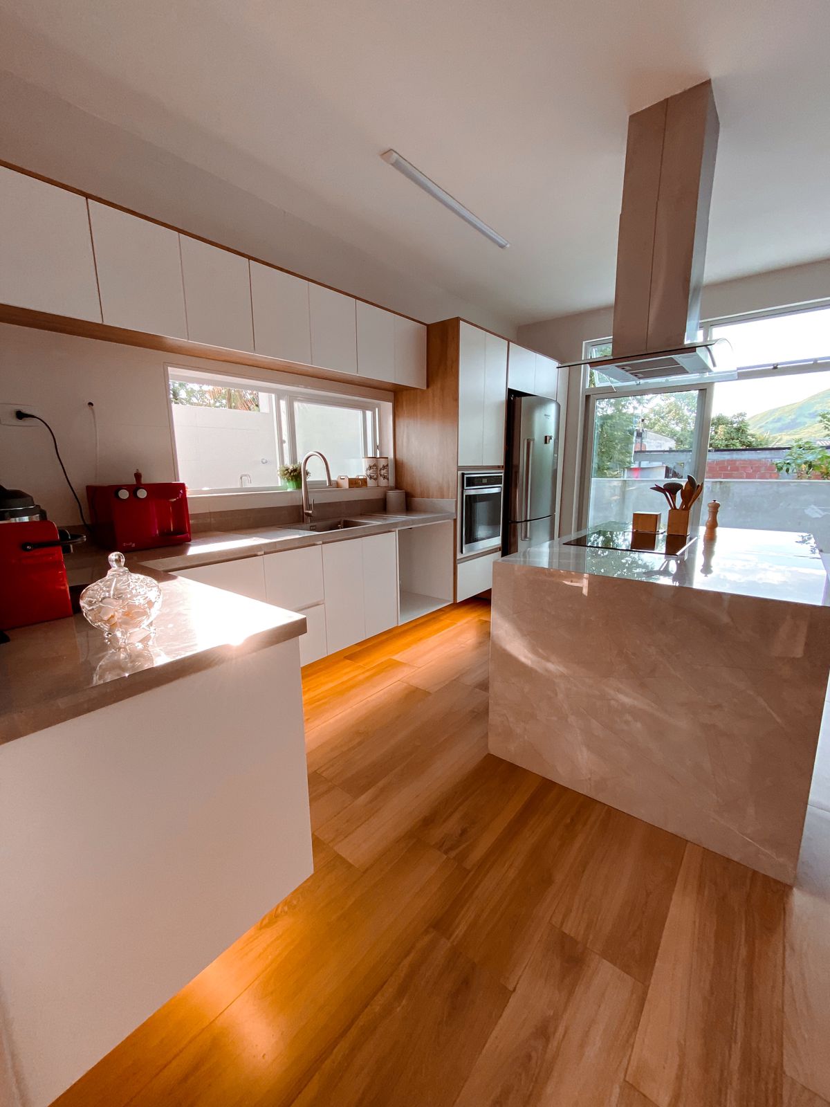 Projeto com design em linhas retas , bancada da pia e ilha em porcelanato, destaque para luz de led .