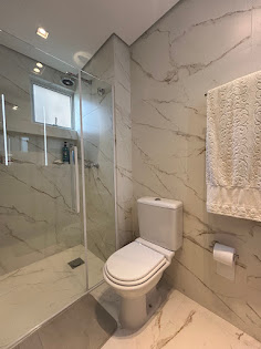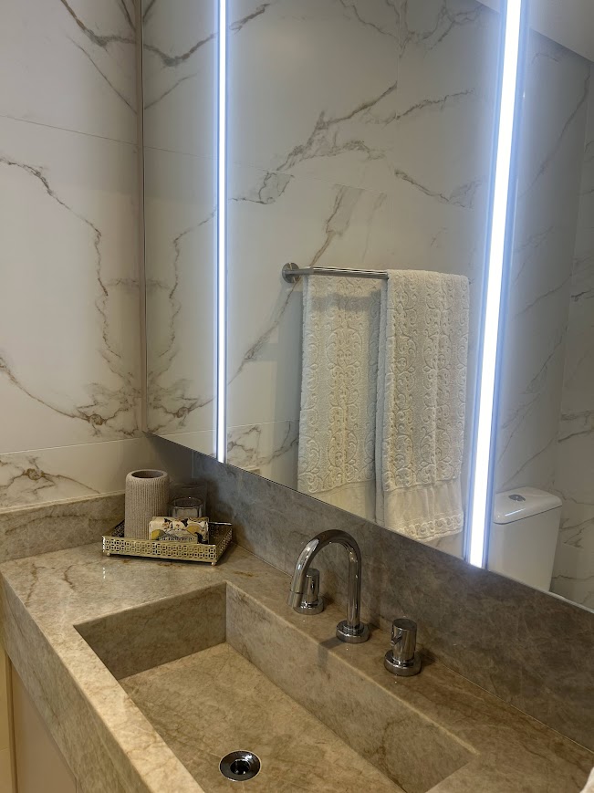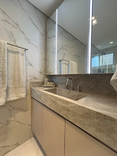 ? Este banheiro é um verdadeiro luxo, com uma cuba esculpida que se destaca em cada detalhe e a sofisticação da pedra Taj Mahal, trazendo leveza e elegância ao ambiente. Um espaço que eleva o conceito de requinte e funcionalidade. ????