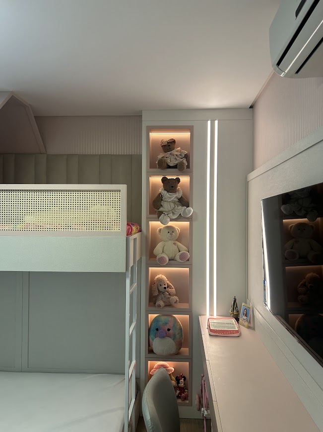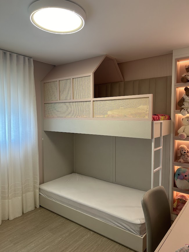 ? Uma suíte dos sonhos de criança! Uma cama alta em formato de casinha que desperta a imaginação, bancada de estudo para aprender e criar, e muito espaço para guardar tudo – desde os itens pessoais até os materiais escolares. Cada detalhe foi pensado para proporcionar liberdade, conforto e diversão. Um espaço onde brincar, estudar e crescer se tornam uma verdadeira experiência.