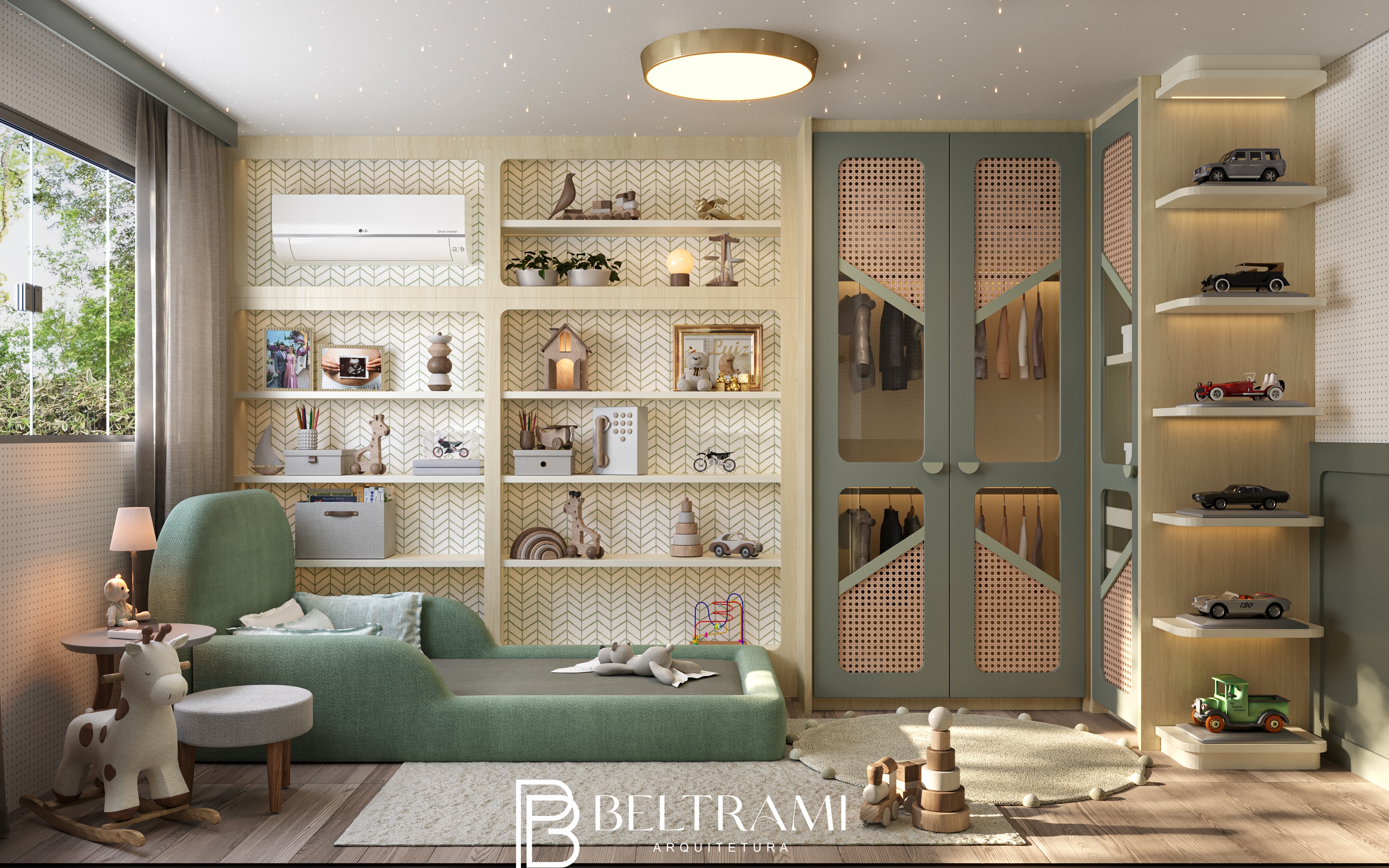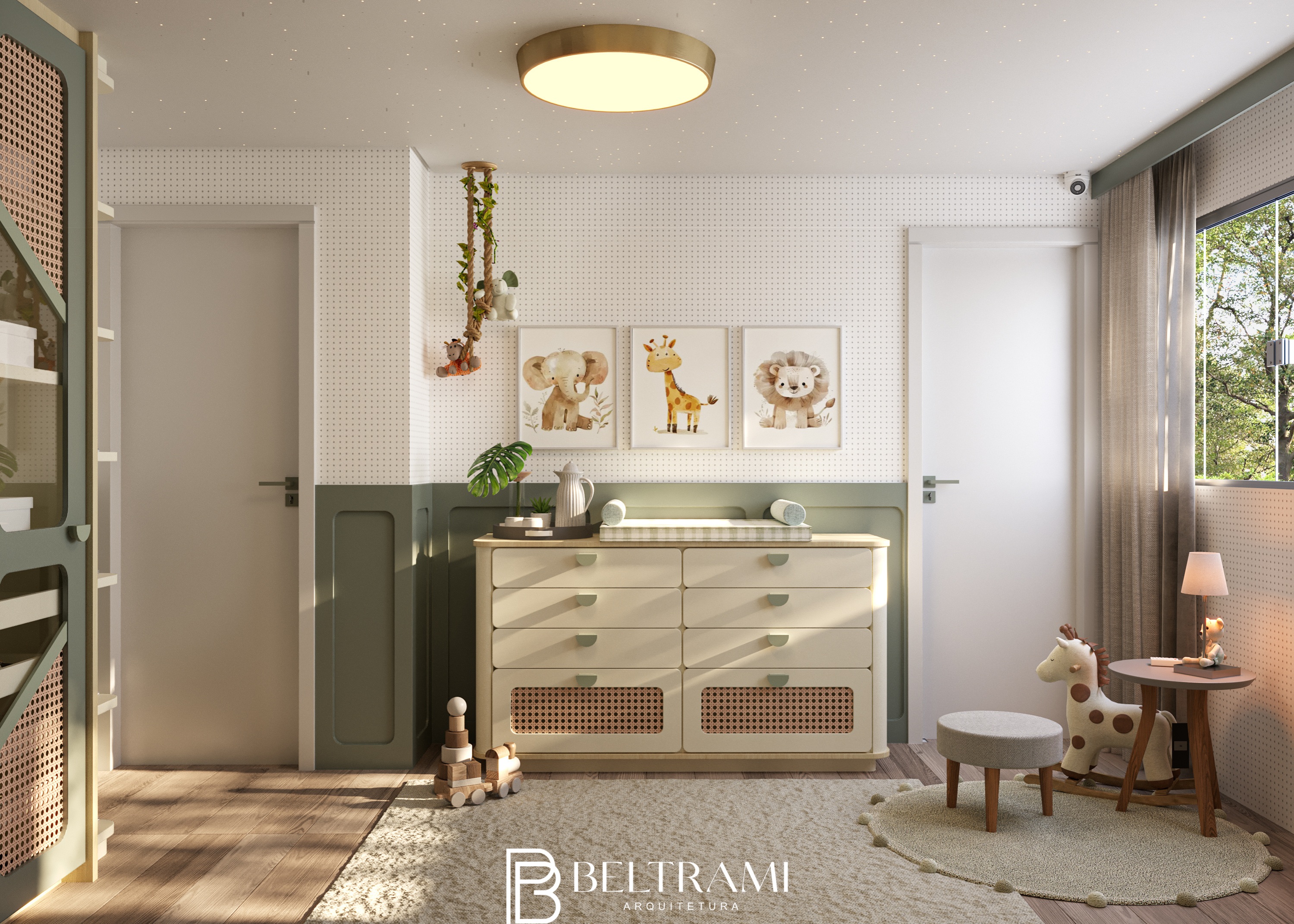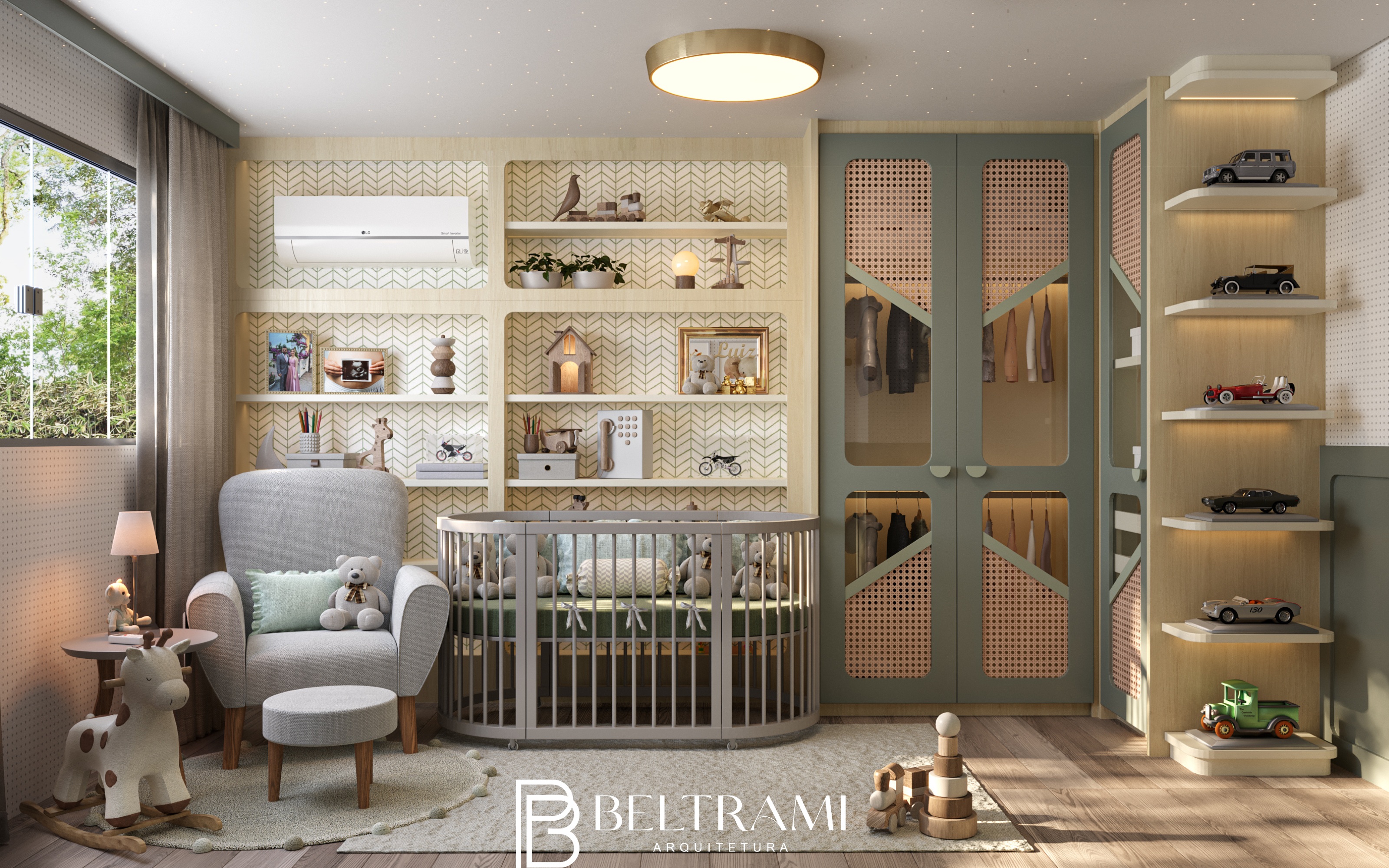 O projeto do quarto de bebê foi pensado com todo carinho, buscando o equilíbrio perfeito entre aconchego, funcionalidade e segurança. Cada detalhe foi cuidadosamente escolhido para proporcionar um ambiente acolhedor e seguro, com cores suaves e móveis que atendem às necessidades dos pais e do bebê.