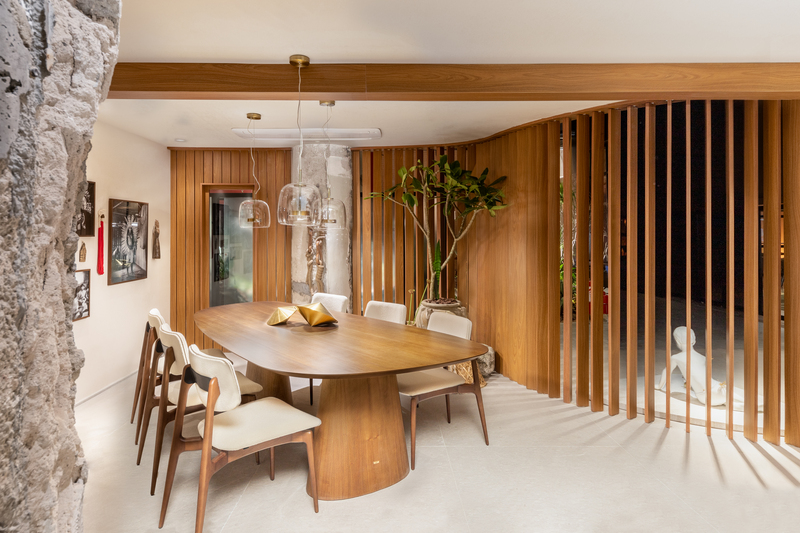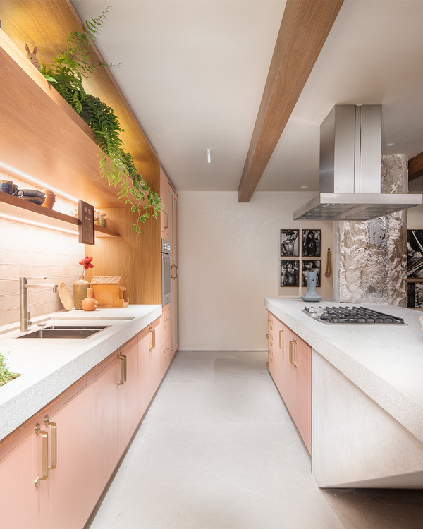 A Cozinha Funcional marca a primeira participação do arquiteto Bruno Moraes na CASACOR São Paulo 2023. Material bem brasileiro, a bancada de granito branco itaúnas e a marcenaria num rosa antigo (CelMar) são as atrações do espaço cheio de histórias | Foto: Guilherme Pucci