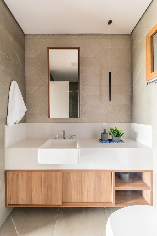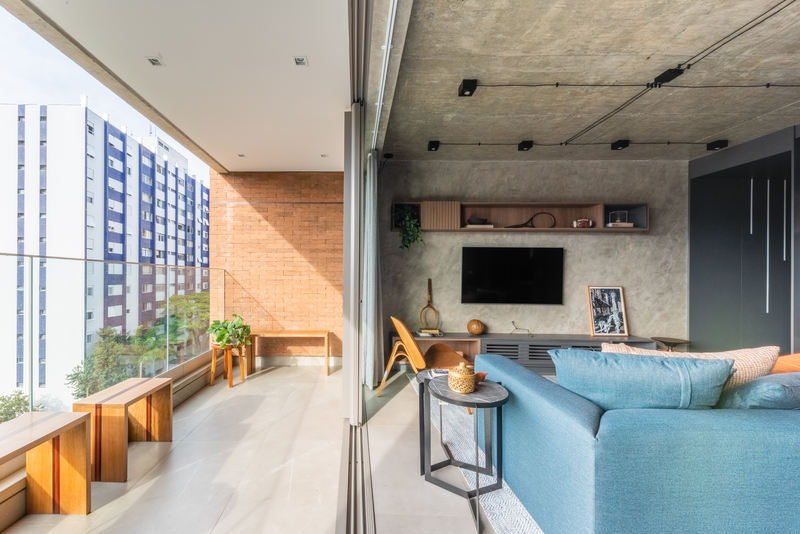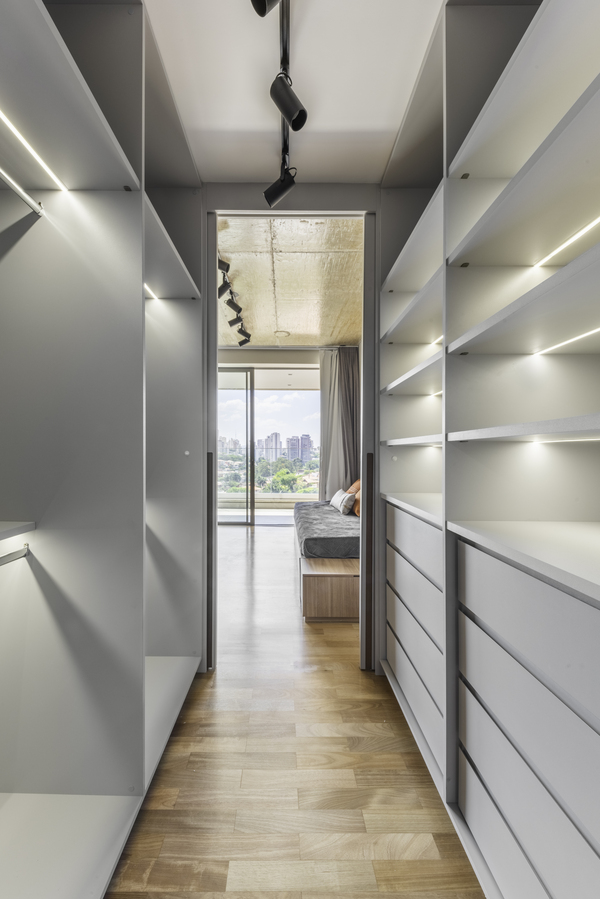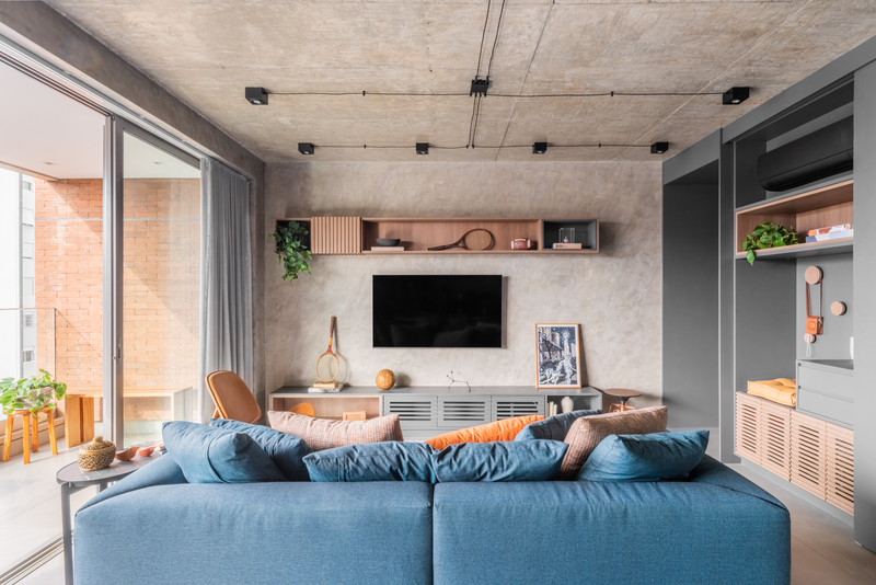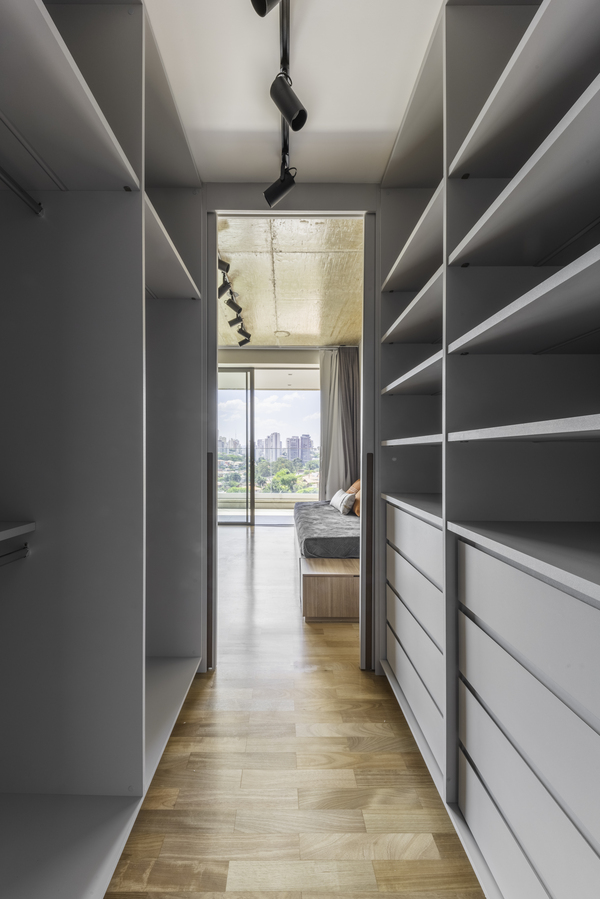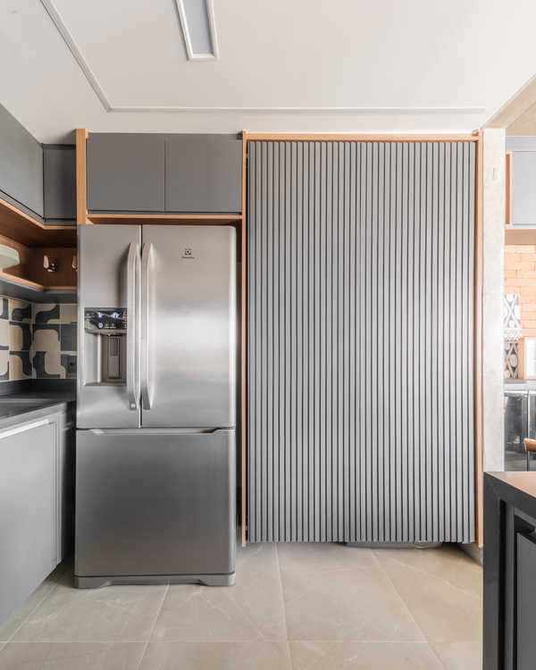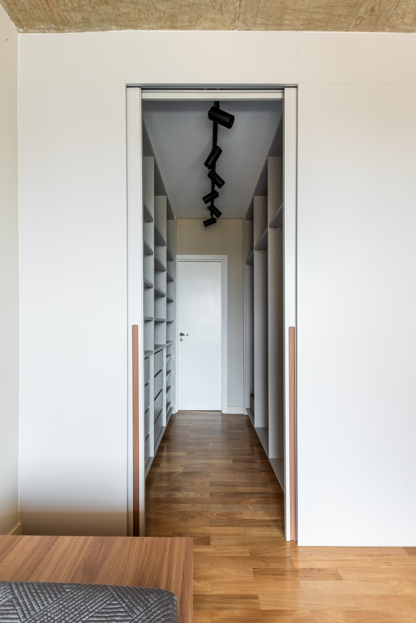 O refúgio particular do Rafael passou por uma série de mudanças que renovaram tanto a área interna, como a externa do duplex. Em linhas gerais, as principais melhorias foram focadas nas soluções de marcenaria que resolveram várias questões – desde o móvel da TV até a porta que camufla a escada ou o cantinho da sapateira, desenhados especialmente para o cliente.