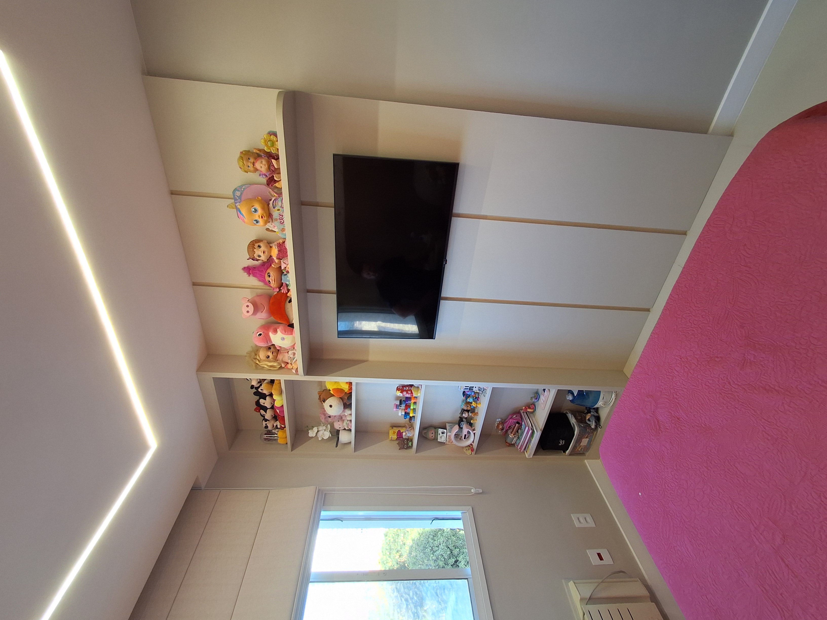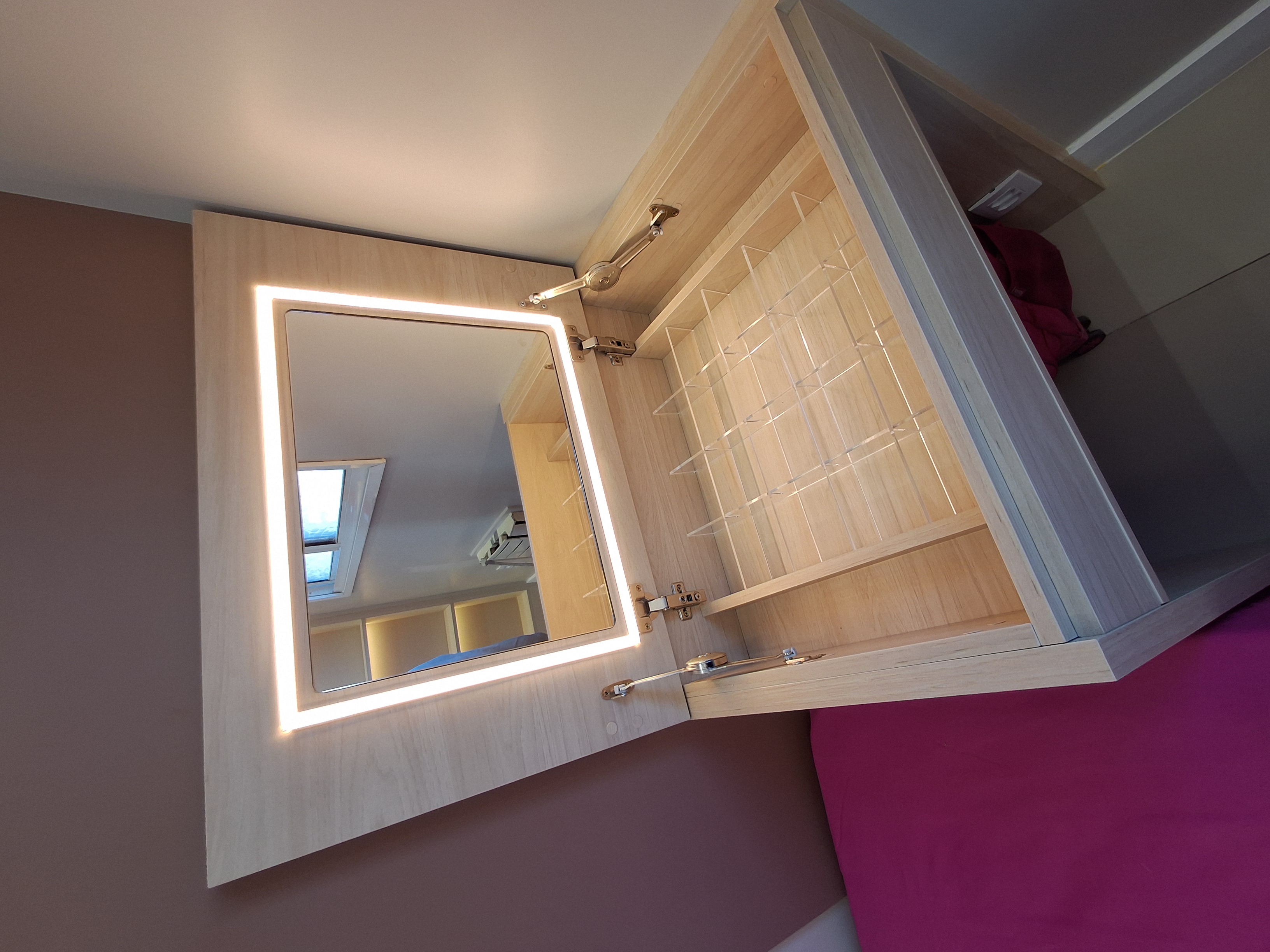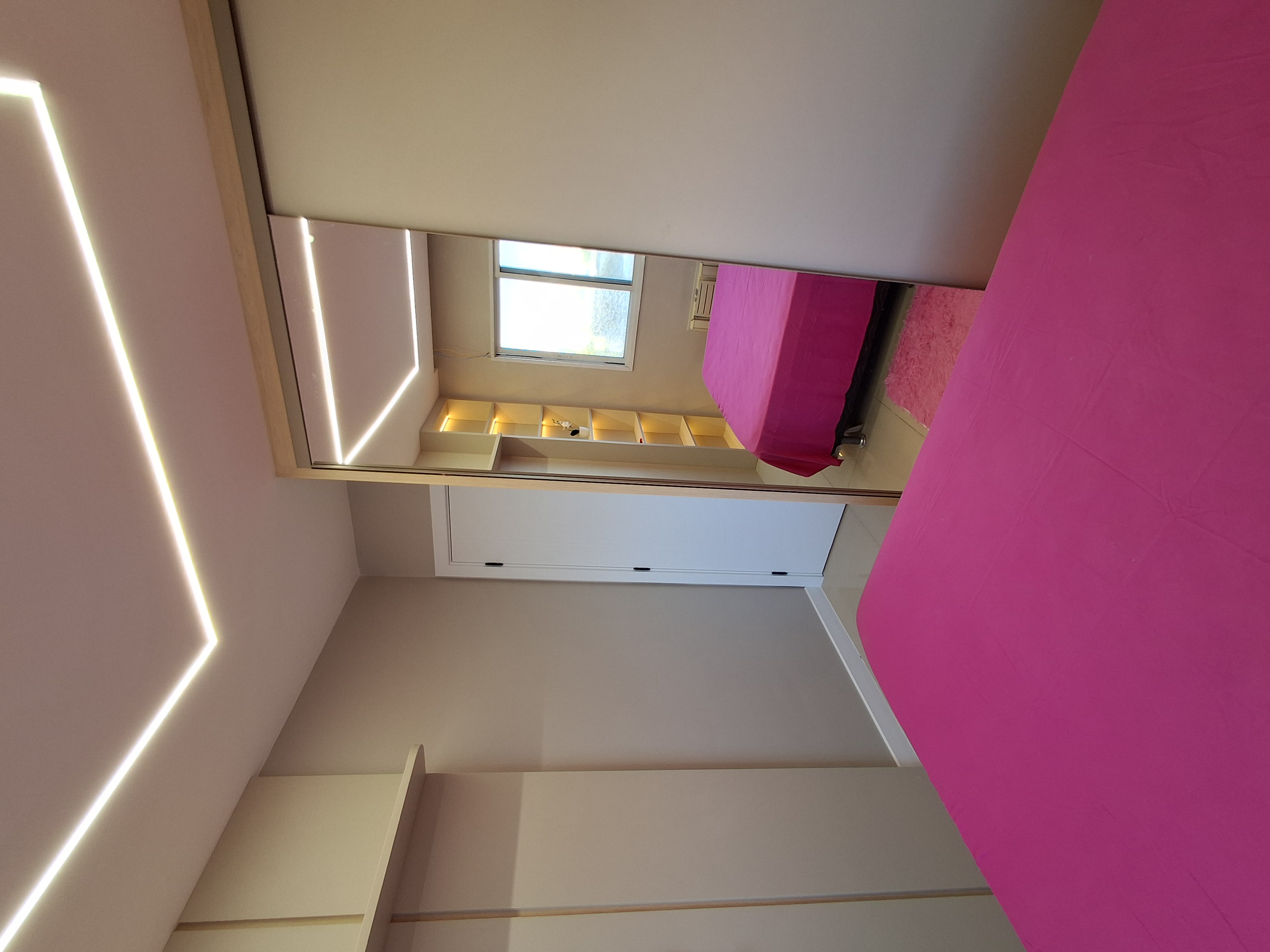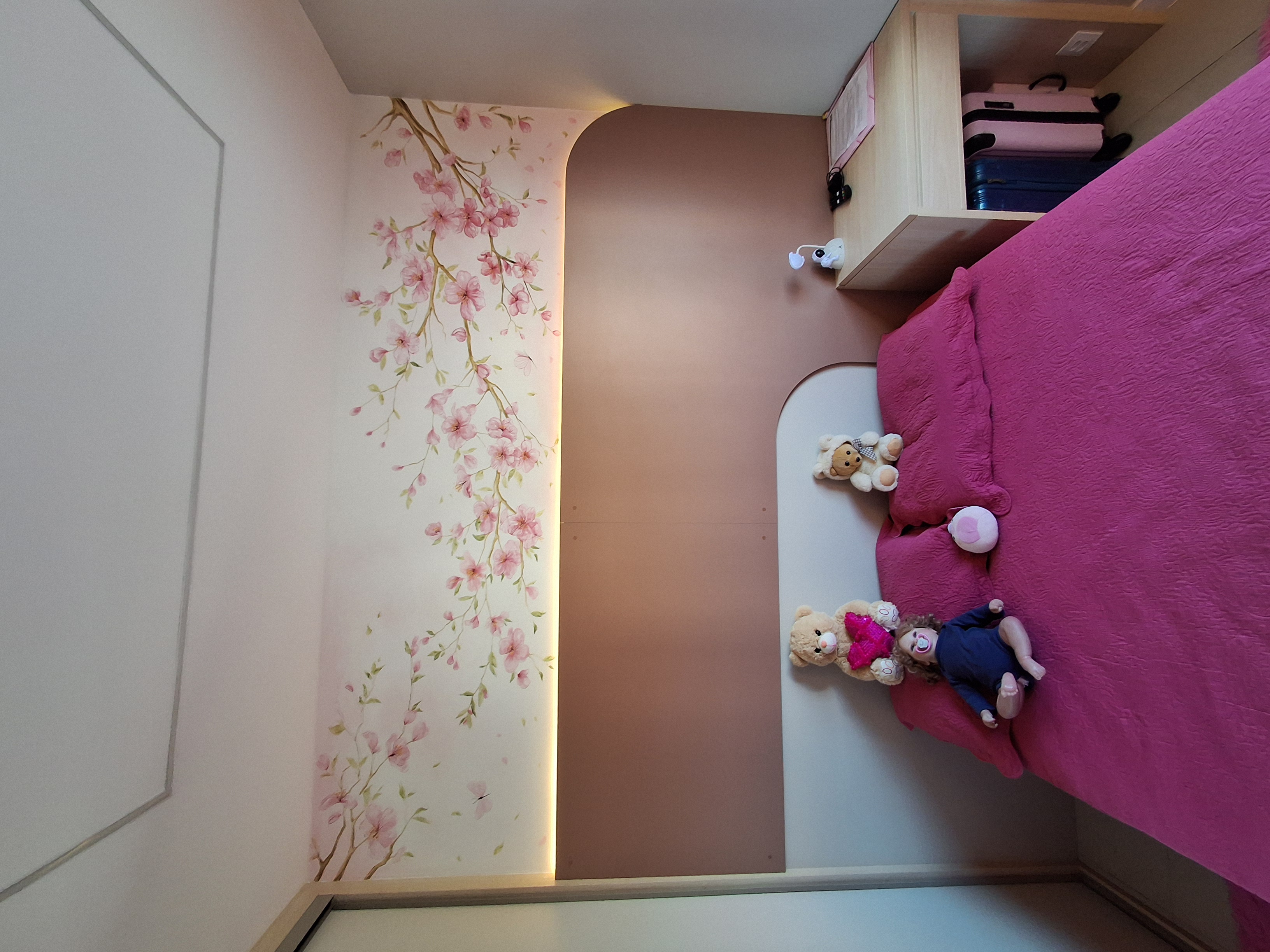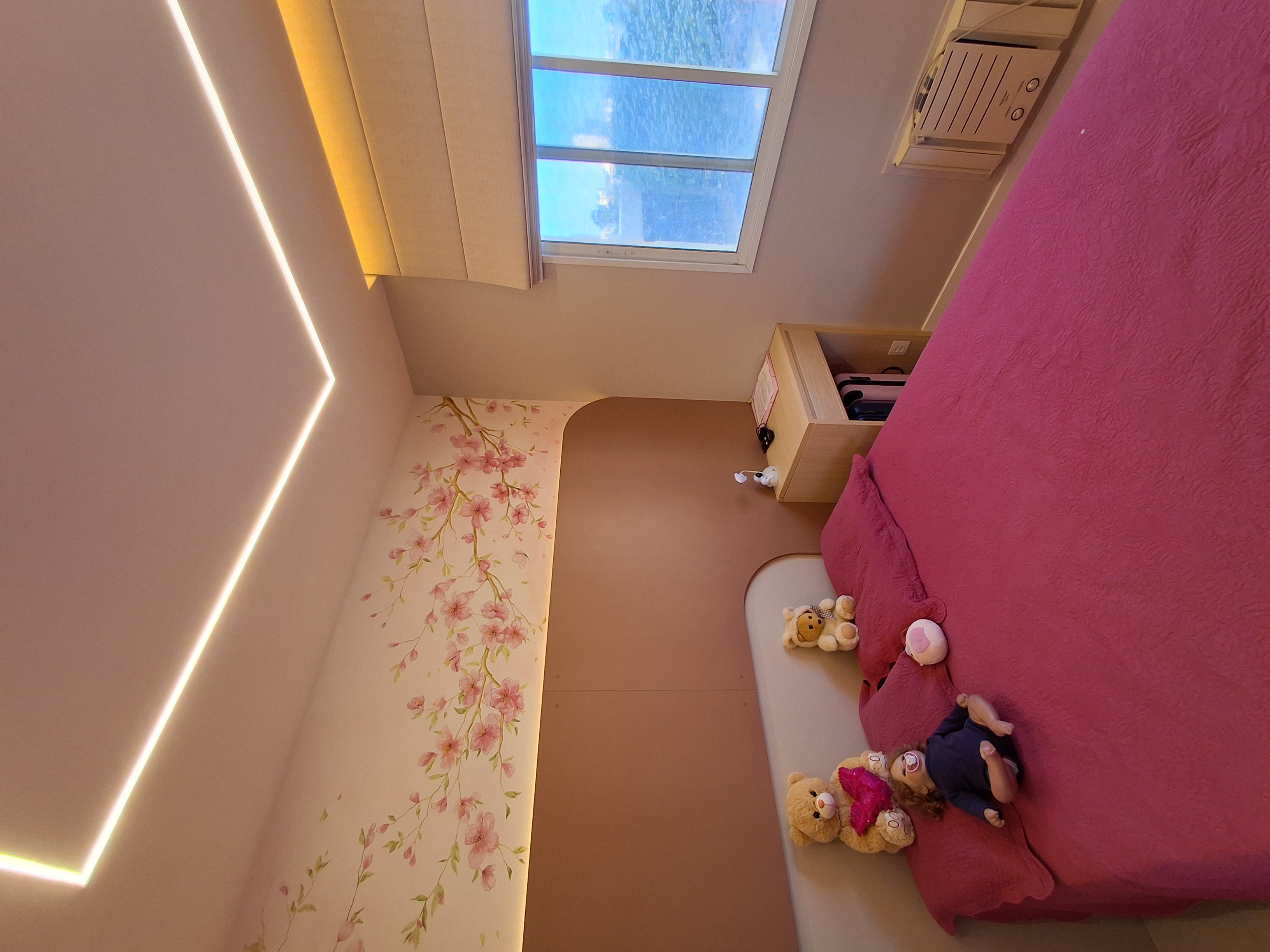 Quarto para menina com móveis em tons neutro destacado com iluminação quente, bancada multiuso penteadeira e escrivaninha, pintura broto de feijão da Suvinil, destaque para cabeceira rosa blush com pintura floral criando uma atmosfera suave
