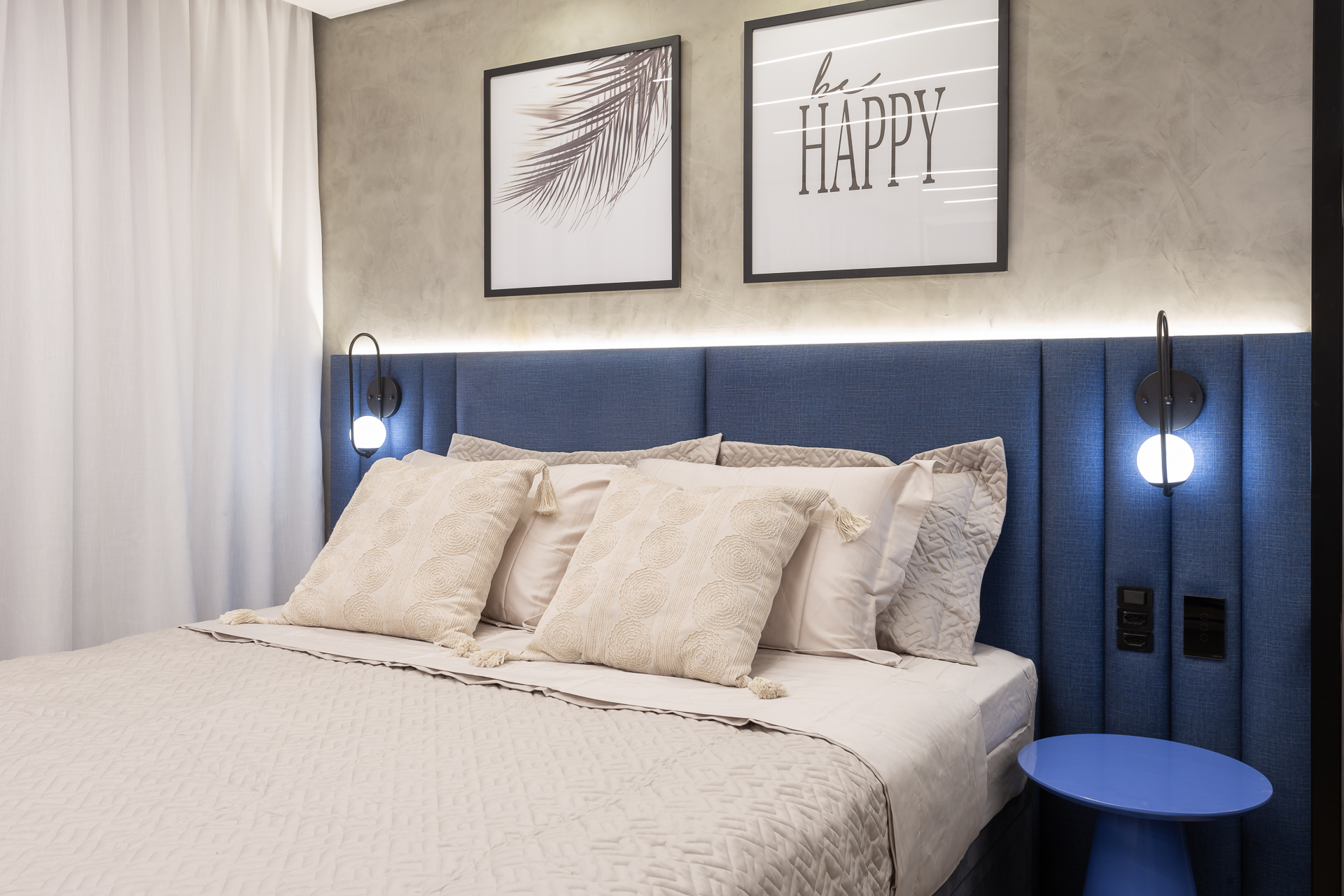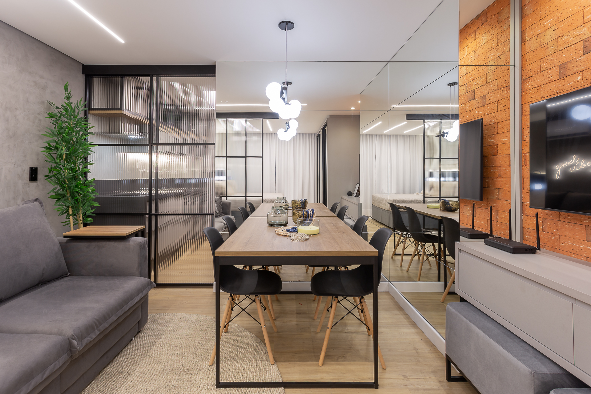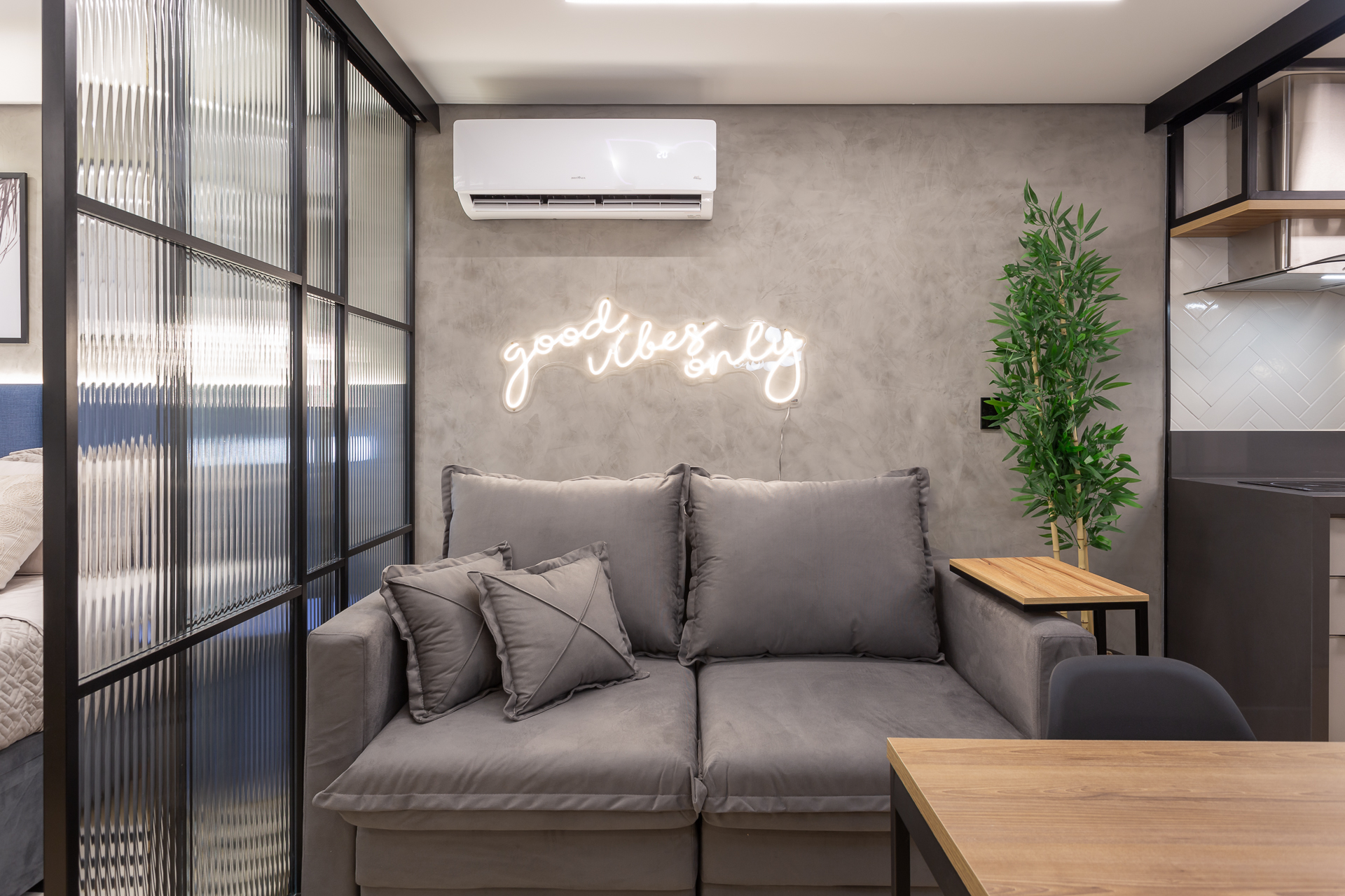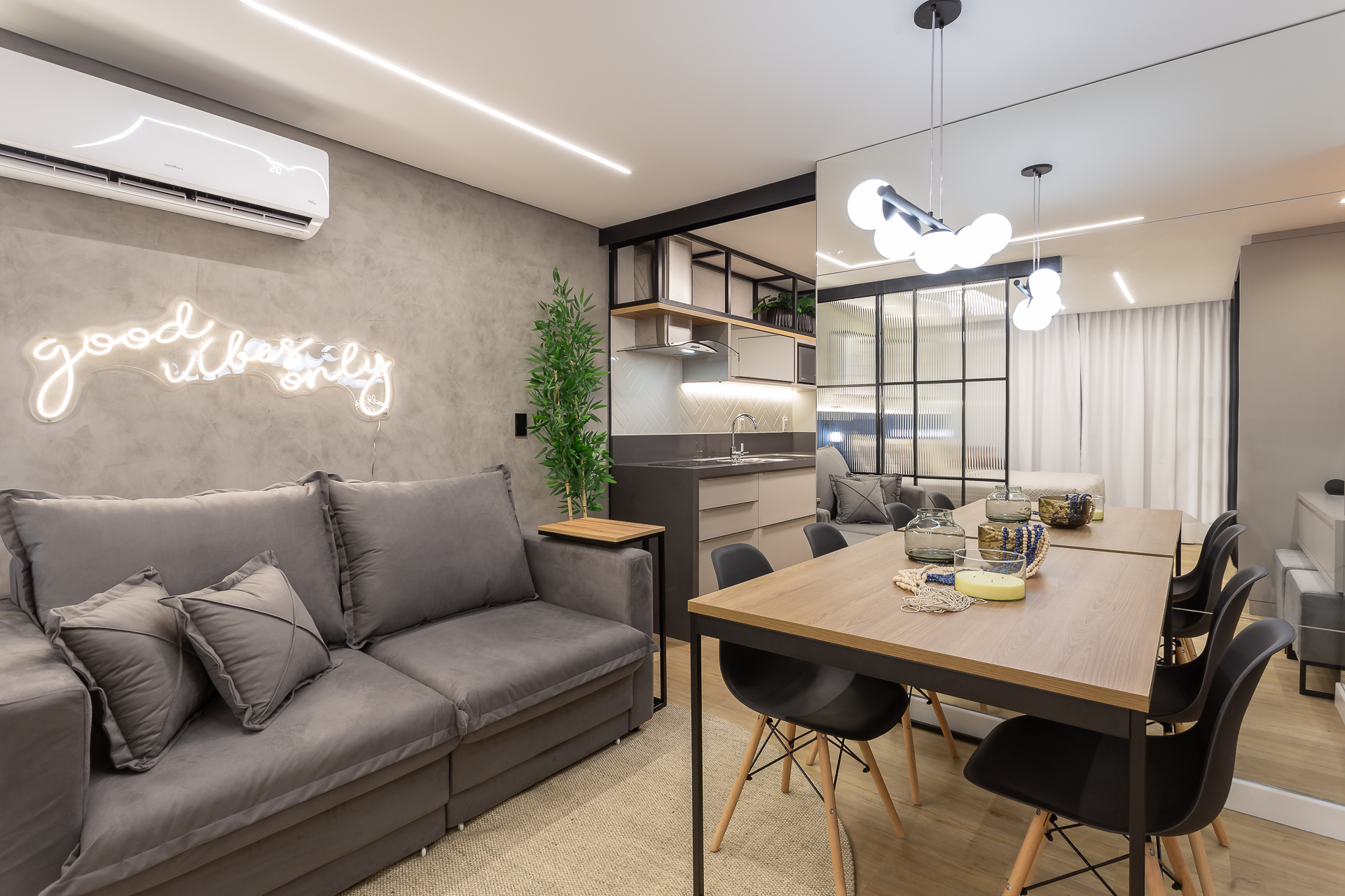 Fomos contatados por uma investidora buscando ajuda para transformar um loft em um espaço especial para locação. Inspirados nos Lofts Nova Iorquinos, adotamos tons de cinza, texturas naturais, serralheria e divisórias de metalon com vidro canelado. Destaques de cor foram o azul jeans e o vermelho da parede de tijolinhos rústicos. O compacto Loft 303, chamado de "Loft Vista ao Mar", foi meticulosamente planejado com marcenaria contemporânea e toques industriais. Equipado e decorado, possui divisórias para privacidade e um sistema de automação controlado pela Alexa.