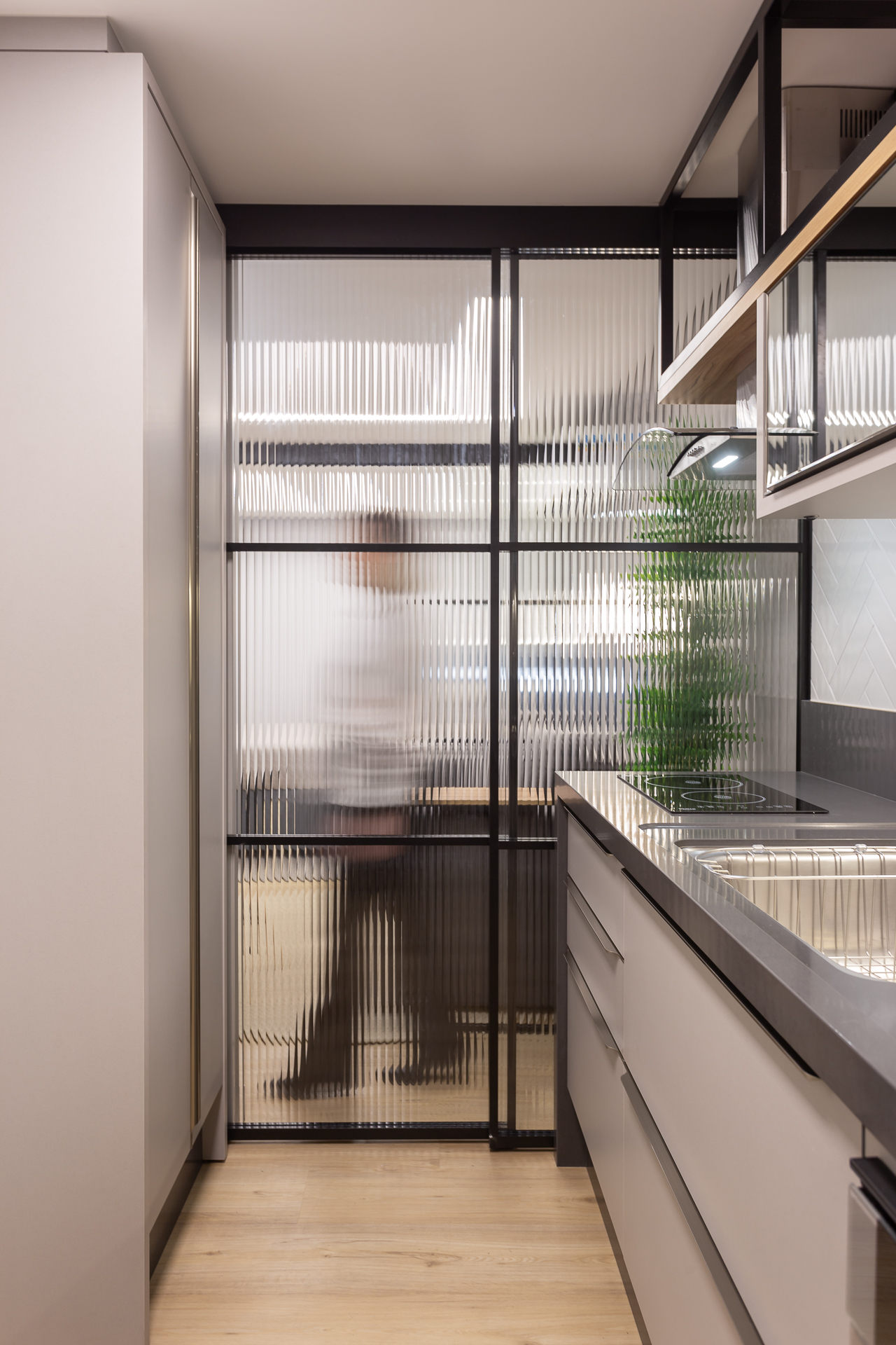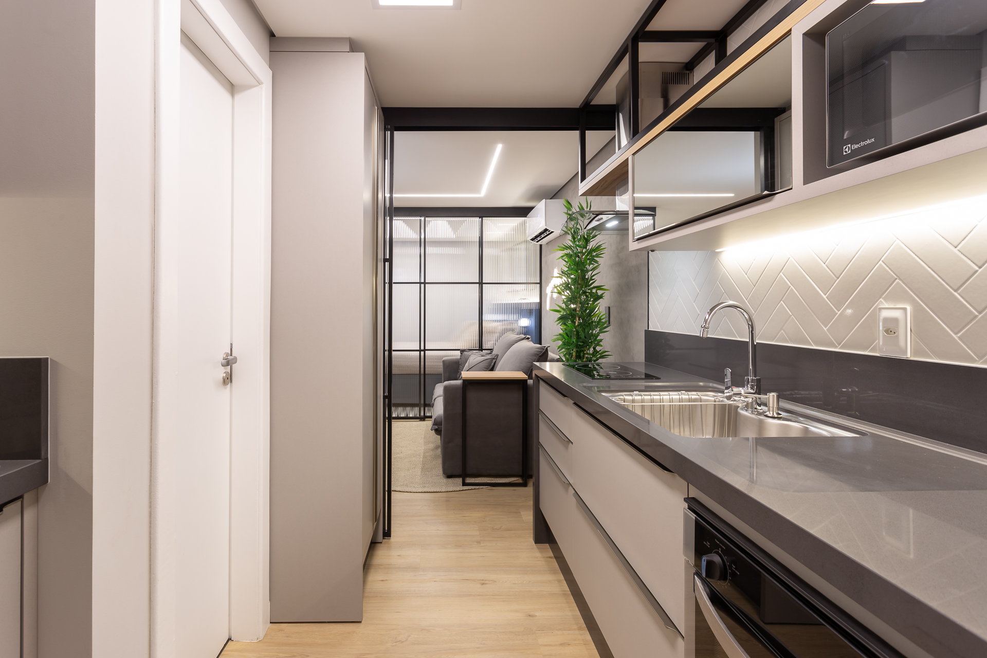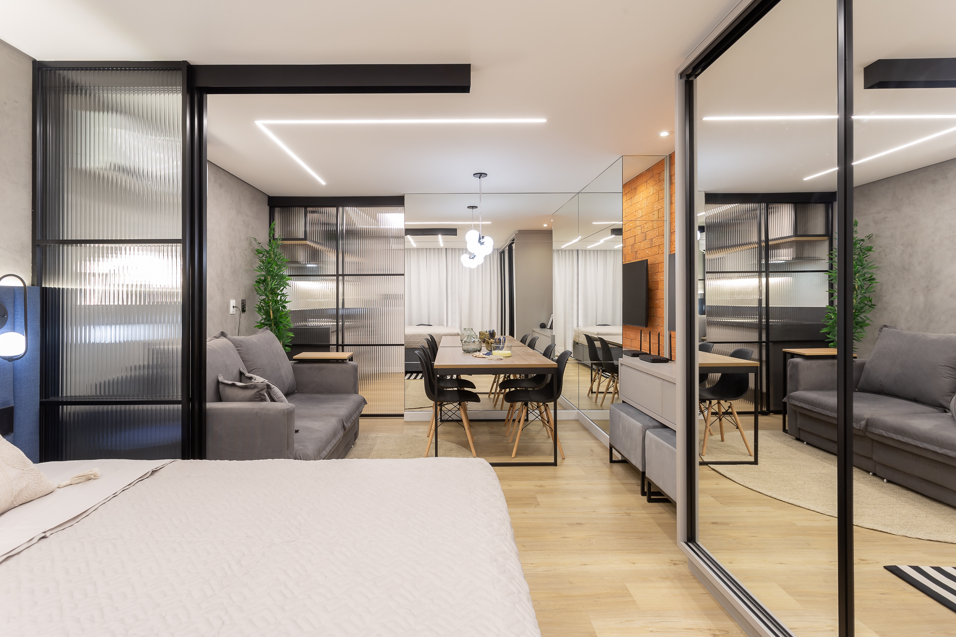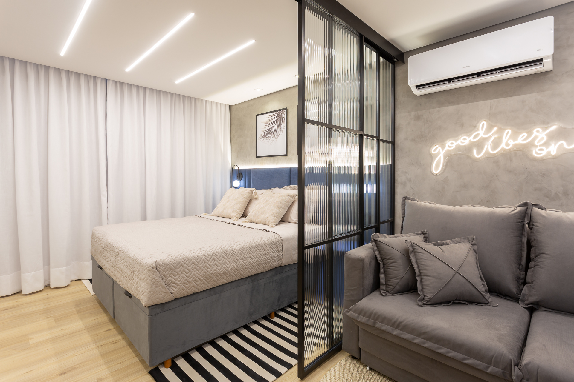 Fomos contatados por uma investidora buscando ajuda para transformar um loft em um espaço especial para locação. Inspirados nos Lofts Nova Iorquinos, adotamos tons de cinza, texturas naturais, serralheria e divisórias de metalon com vidro canelado. Destaques de cor foram o azul jeans e o vermelho da parede de tijolinhos rústicos. O compacto Loft 303, chamado de "Loft Vista ao Mar", foi meticulosamente planejado com marcenaria contemporânea e toques industriais. Equipado e decorado, possui divisórias para privacidade e um sistema de automação controlado pela Alexa.
