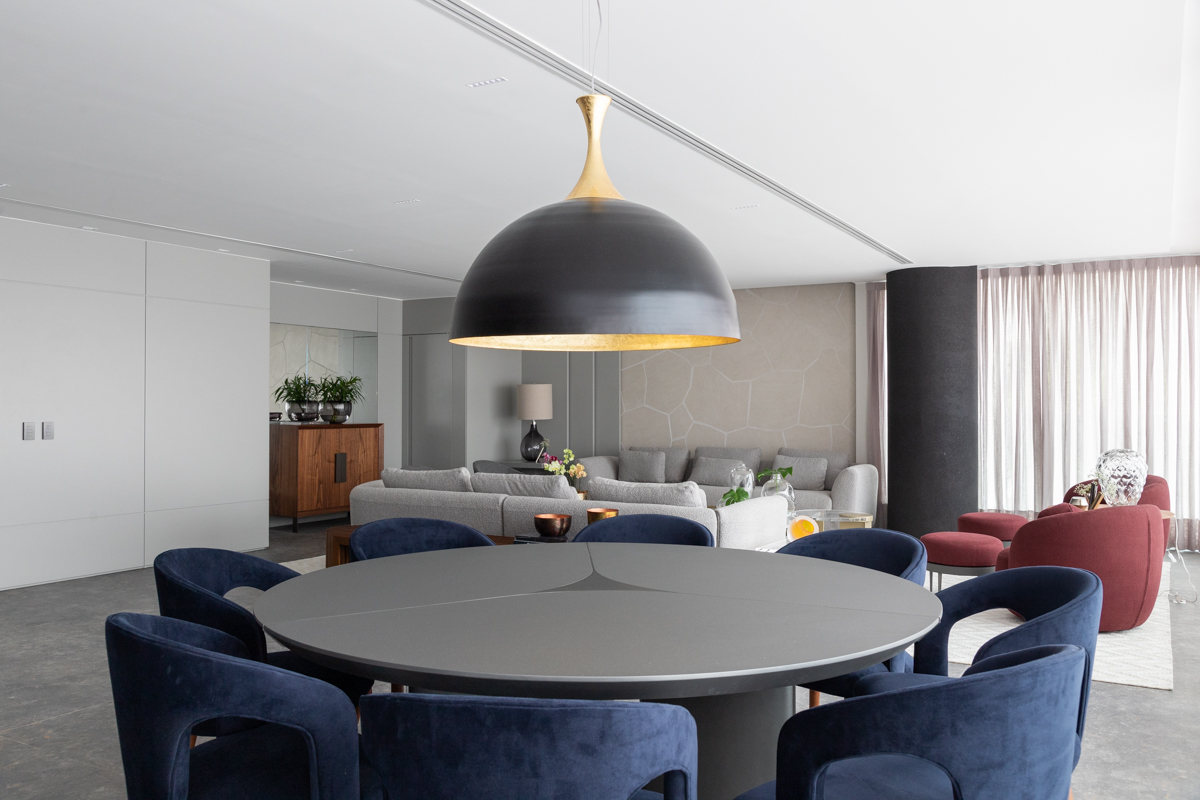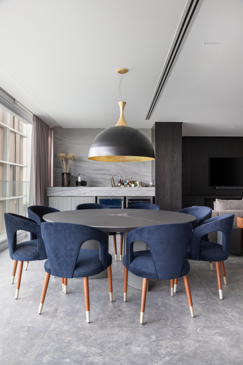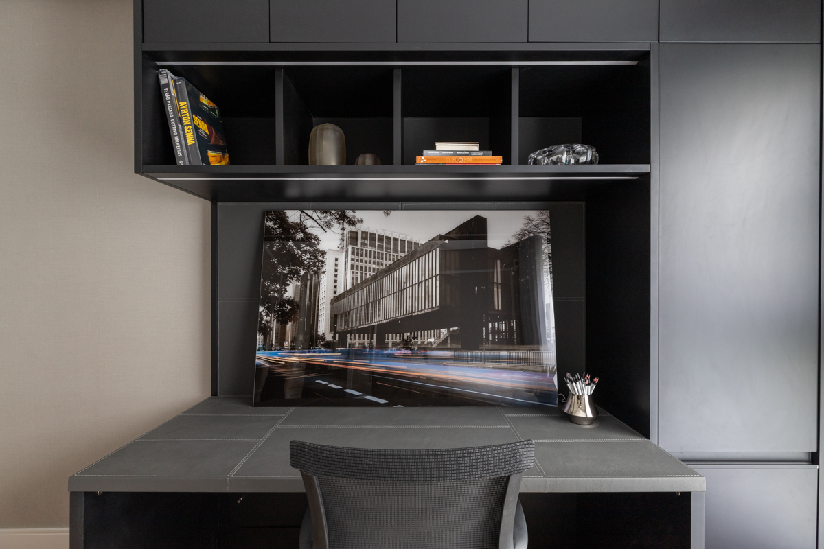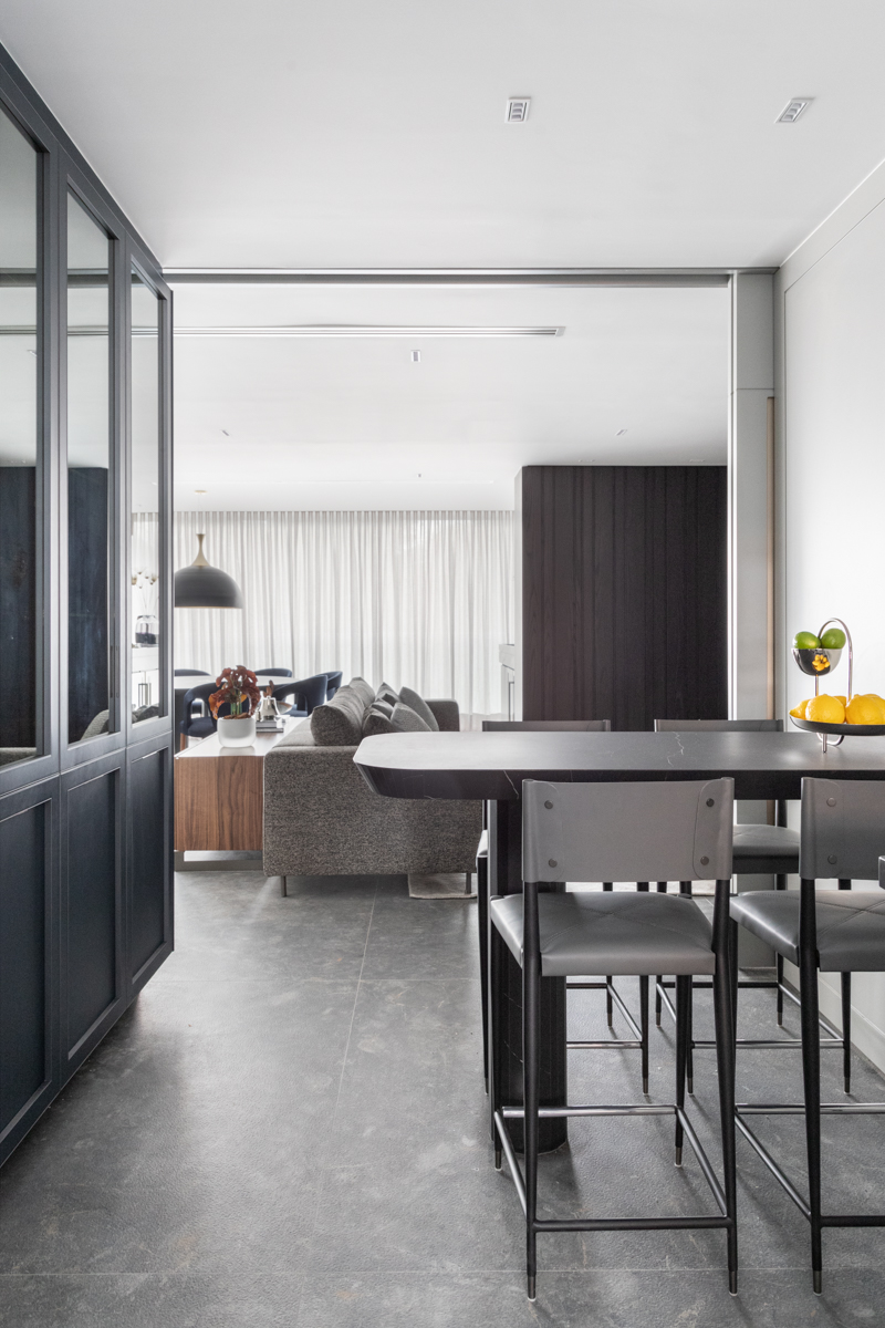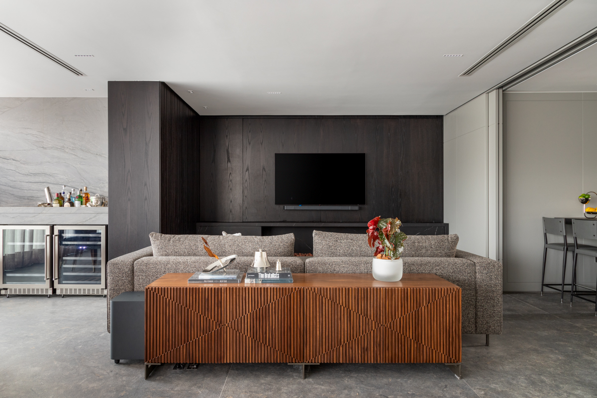 Com ambientes integrados, tons sóbrios e soluções sob medida, o projeto alia funcionalidade e sofisticação