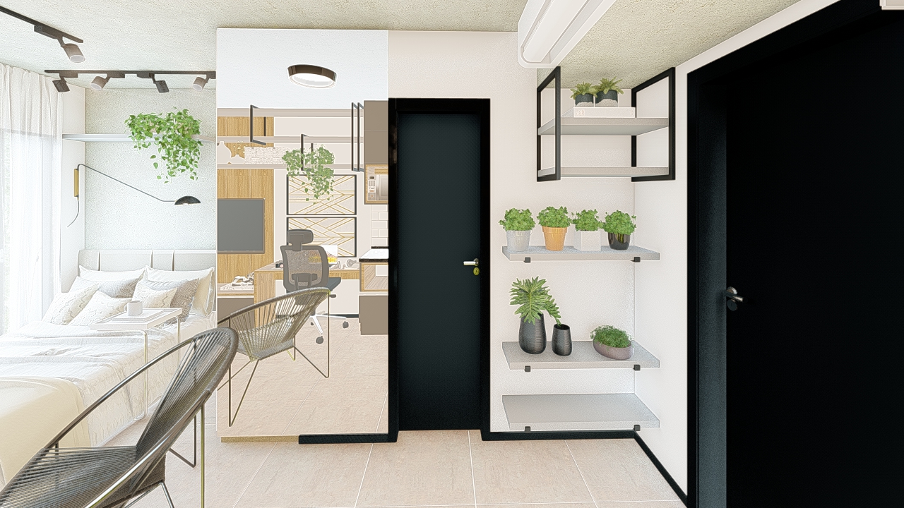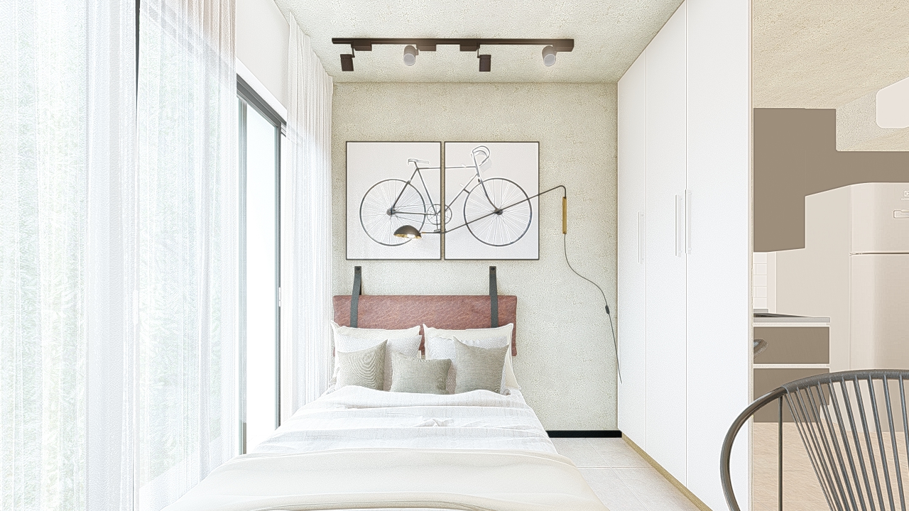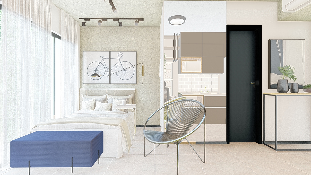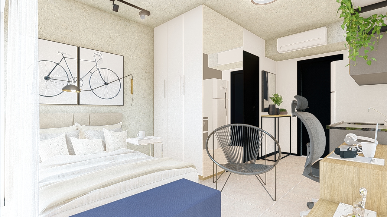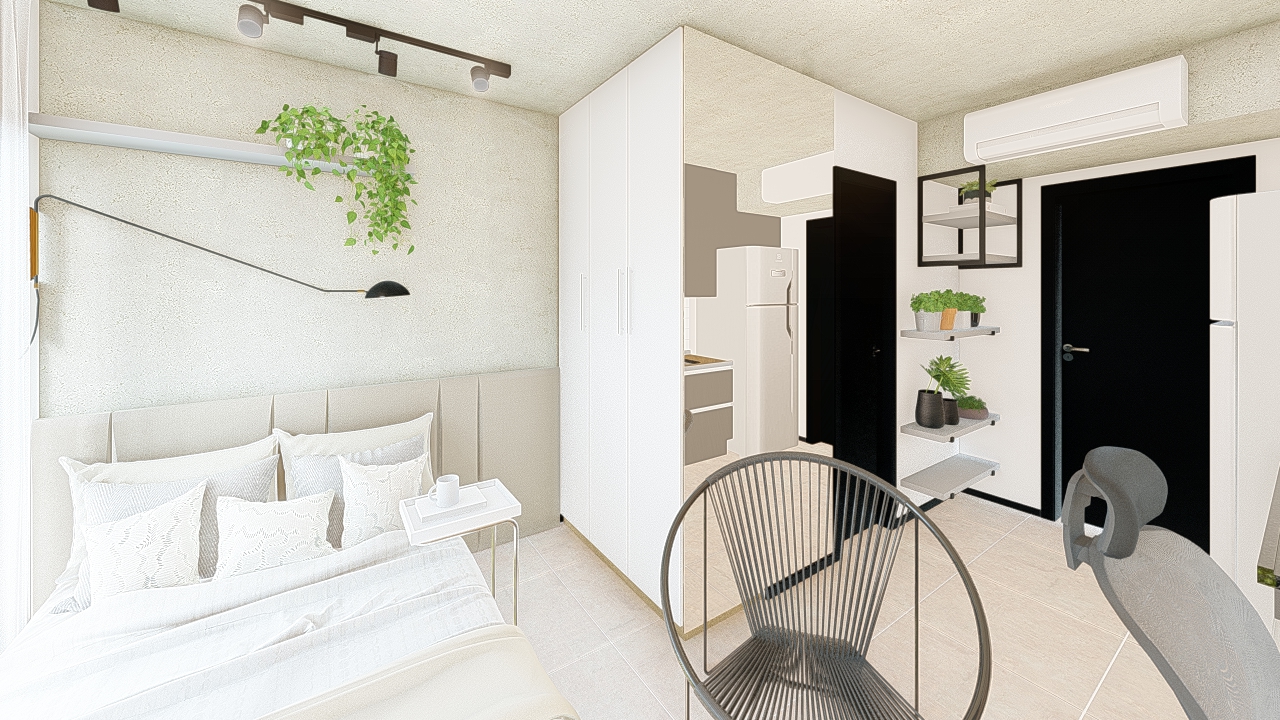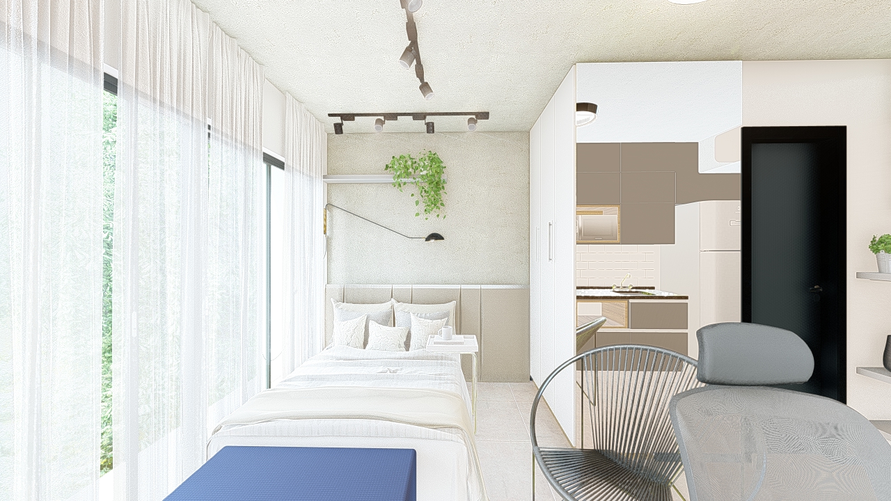 O projeto apresenta uma proposta de interiores com estética minimalista e atmosfera leve, explorando tons neutros e texturas suaves. A composição equilibra funcionalidade e conforto, com mobiliário de linhas finas e design contemporâneo. O uso de materiais claros amplia a luminosidade natural, enquanto elementos pontuais em preto e madeira conferem contraste e sofisticação. A iluminação técnica, com trilhos e pendentes sutis, valoriza as áreas de uso e reforça o caráter moderno do ambiente.