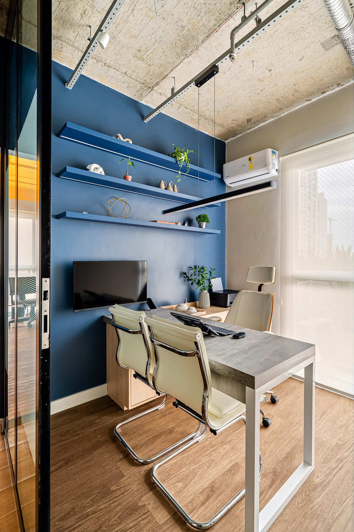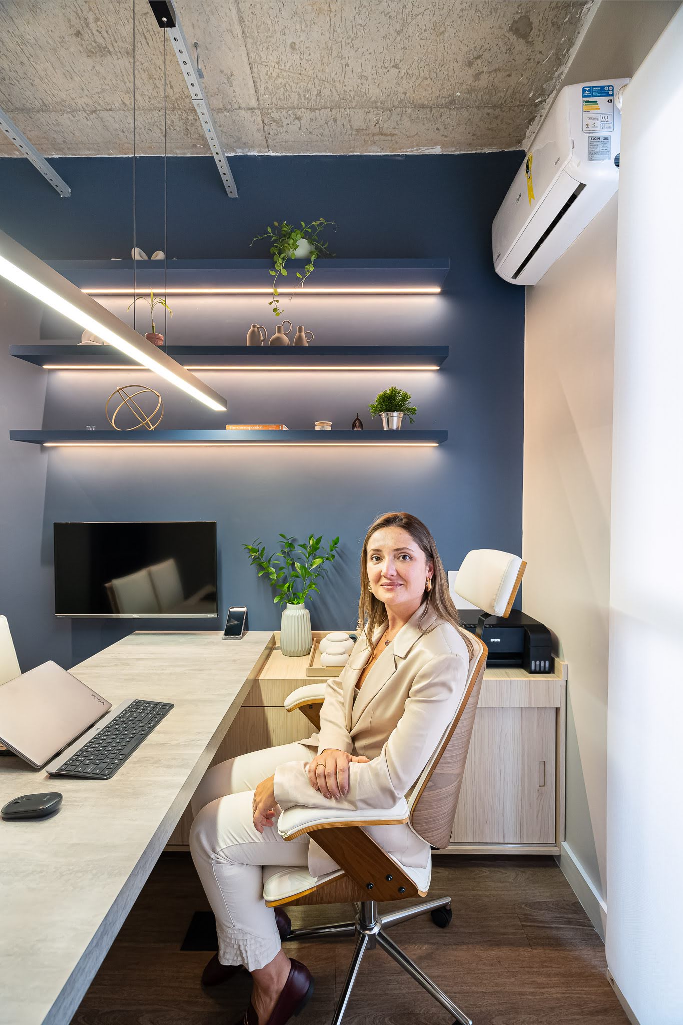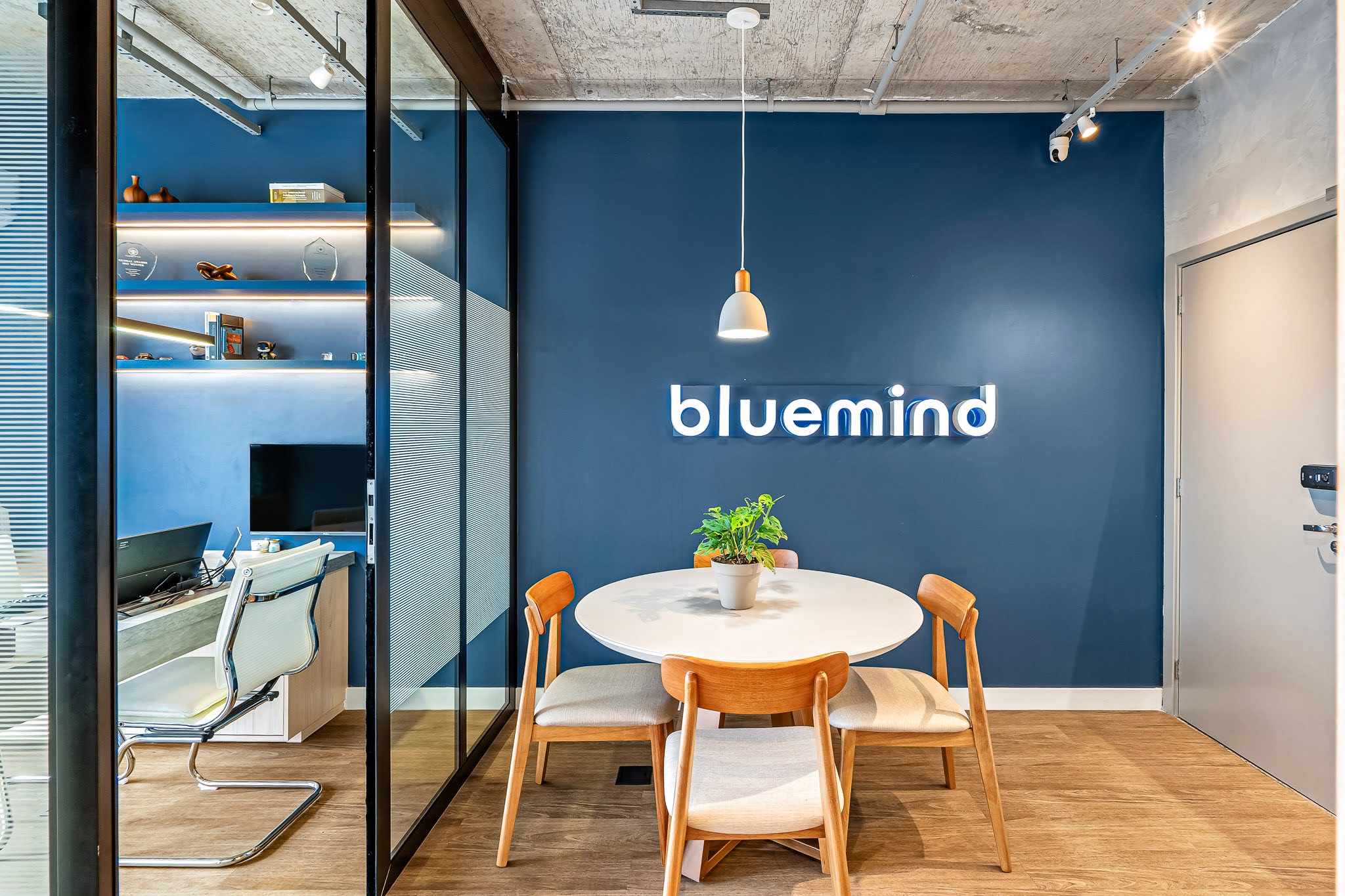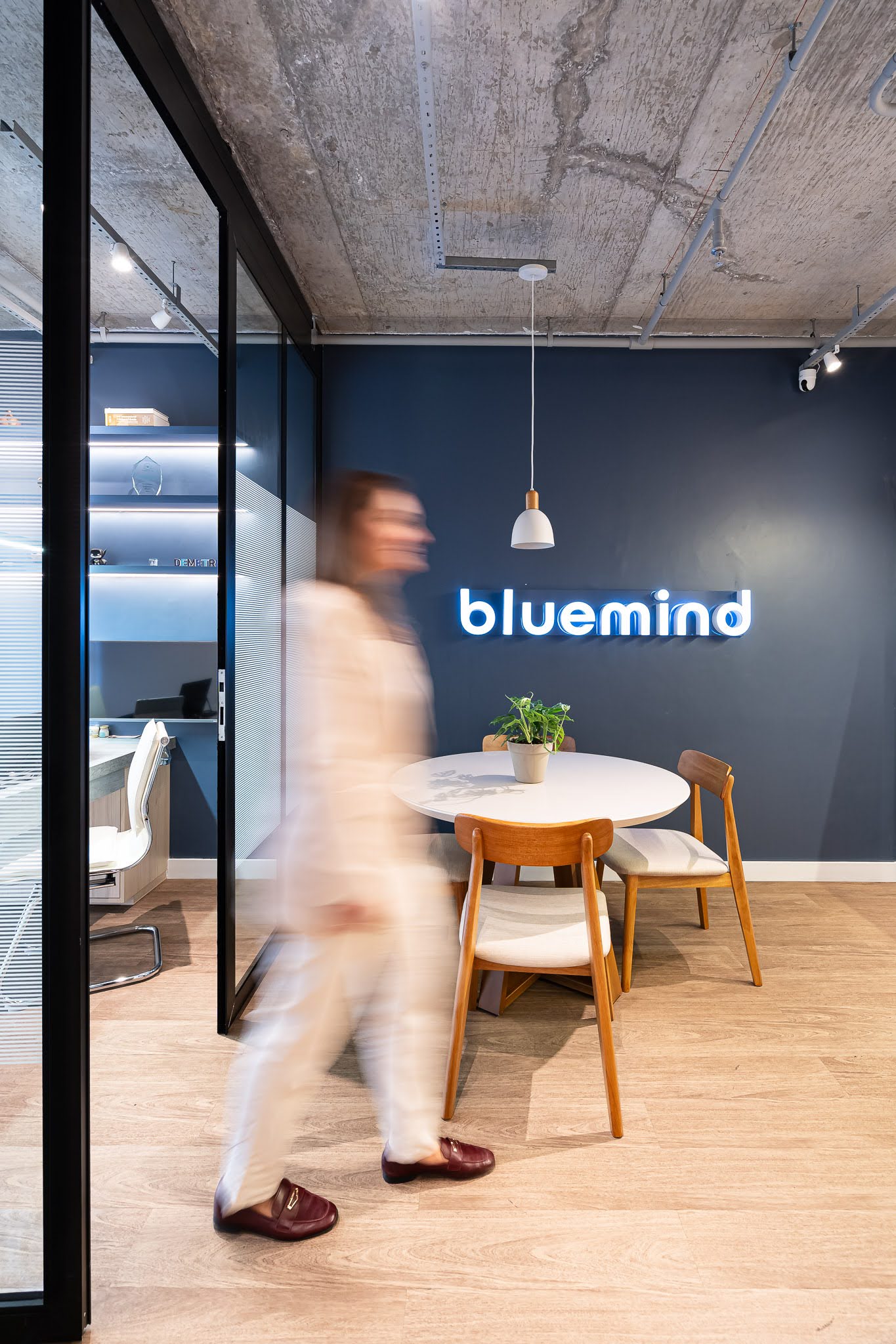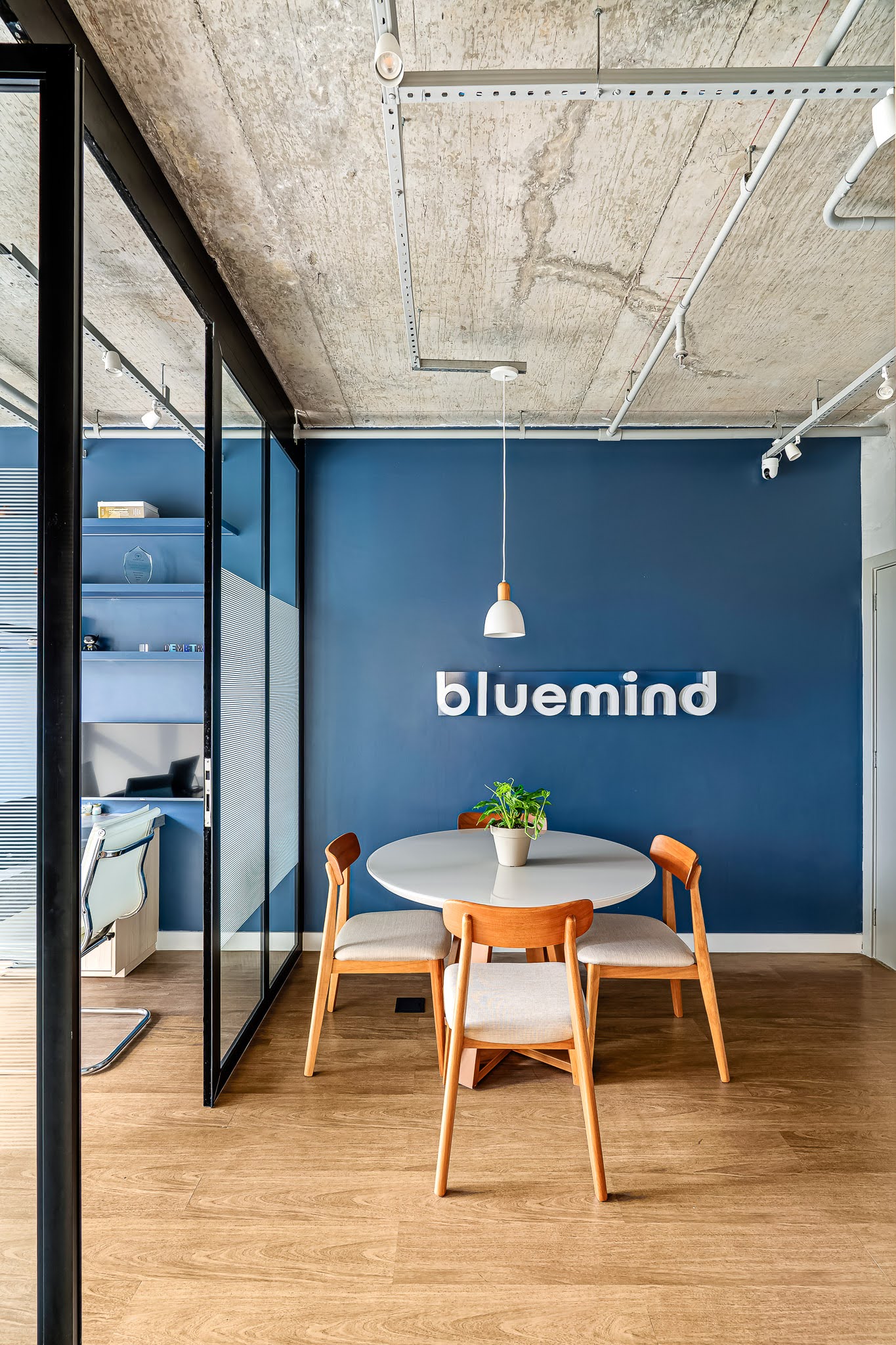 O Projeto Bluemind transforma duas salas comerciais, uma copa e um lavabo em espaços funcionais e cheios de identidade. As paredes focais no tom Azul Baleia reforçam a essência da marca, enquanto a marcenaria sob medida organiza e traz fluidez ao layout. Mesmo sendo salas alugadas, soluções inteligentes, acabamentos amadeirados e iluminação pontual criaram um ambiente acolhedor, contemporâneo e alinhado ao propósito dos sócios.