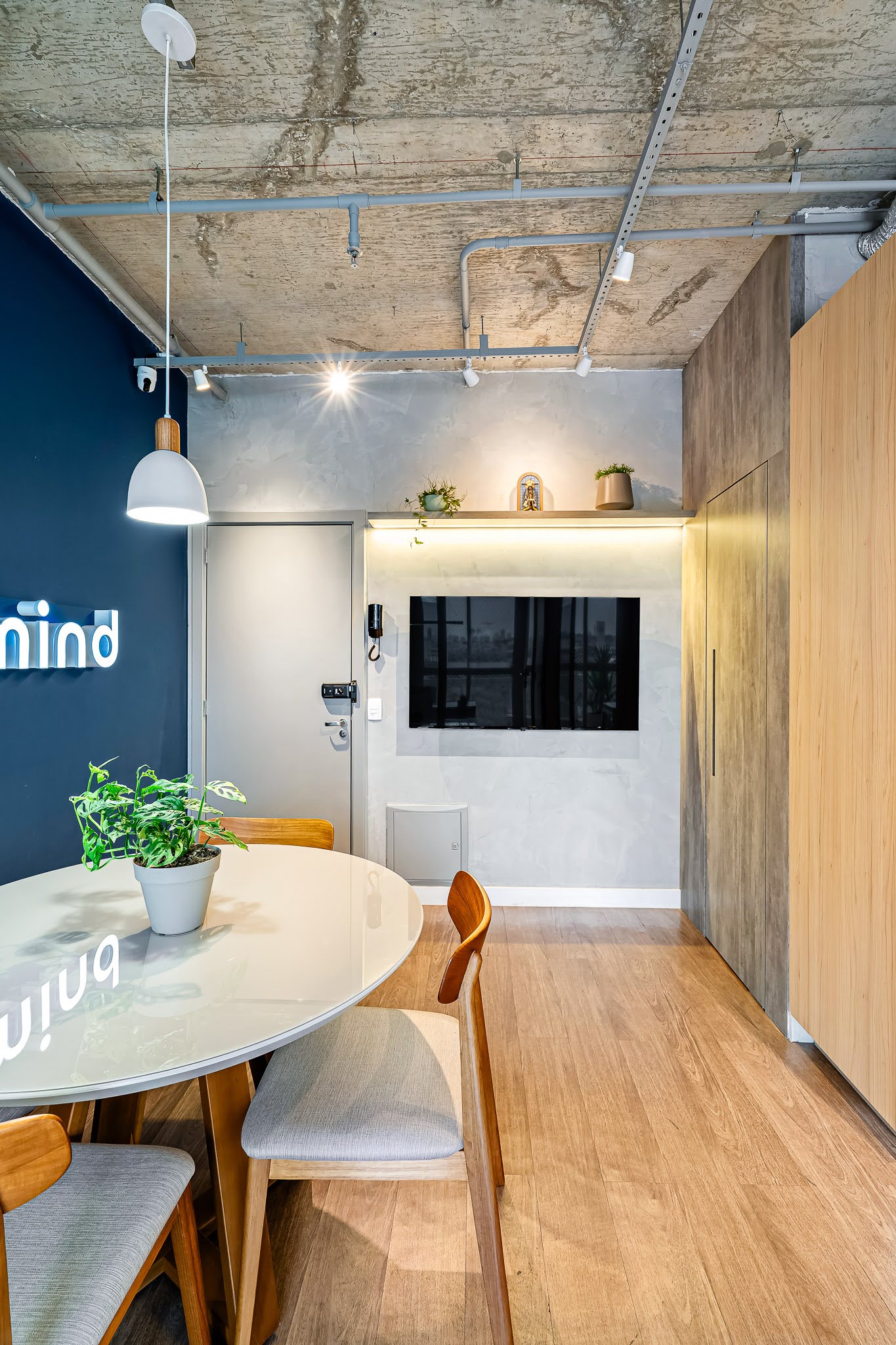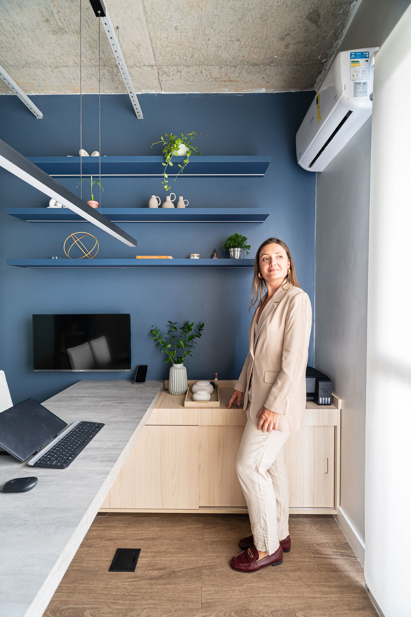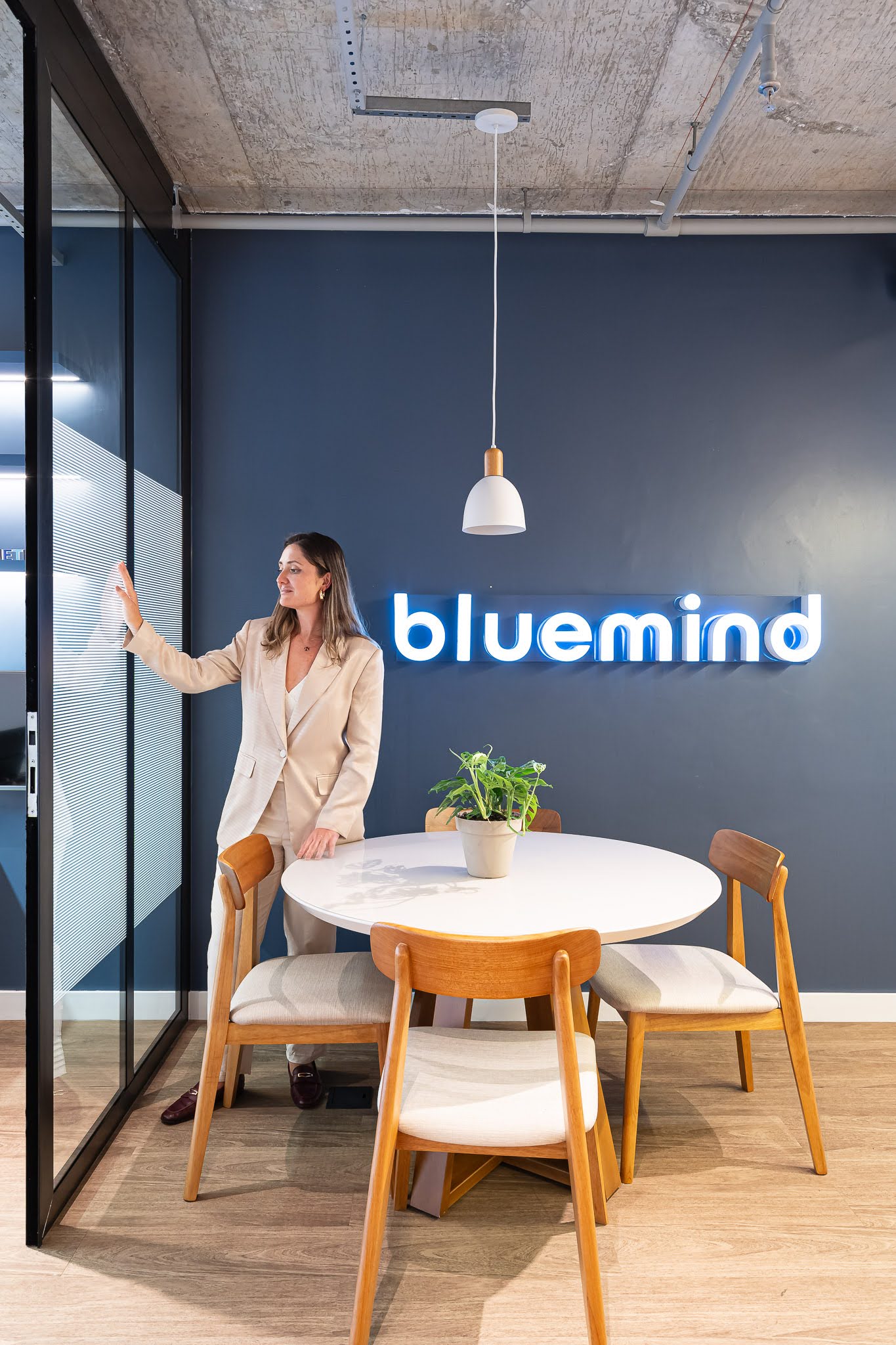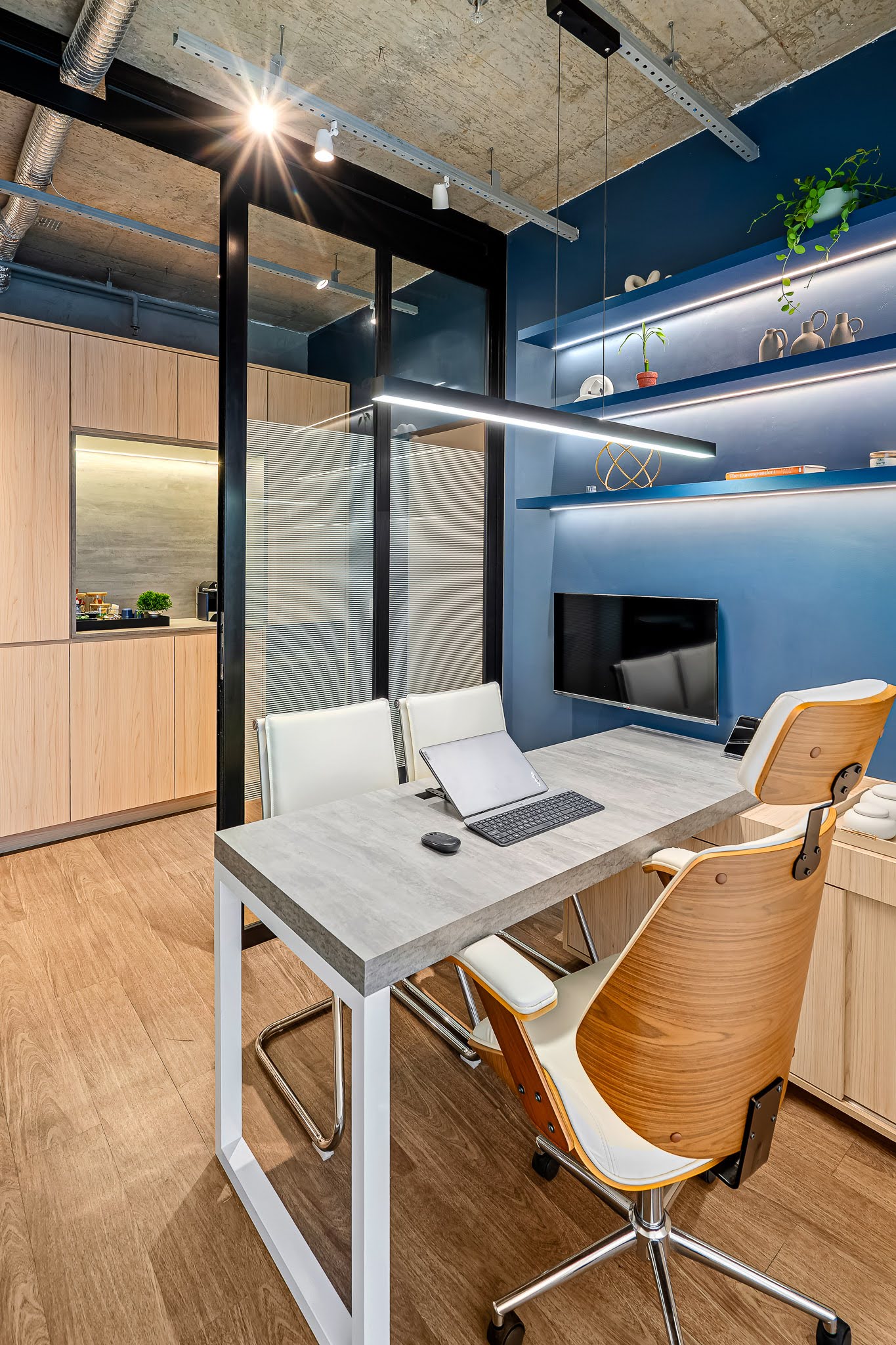 O Projeto Bluemind transforma duas salas comerciais, uma copa e um lavabo em espaços funcionais e cheios de identidade. As paredes focais no tom Azul Baleia reforçam a essência da marca, enquanto a marcenaria sob medida organiza e traz fluidez ao layout. Mesmo sendo salas alugadas, soluções inteligentes, acabamentos amadeirados e iluminação pontual criaram um ambiente acolhedor, contemporâneo e alinhado ao propósito dos sócios.