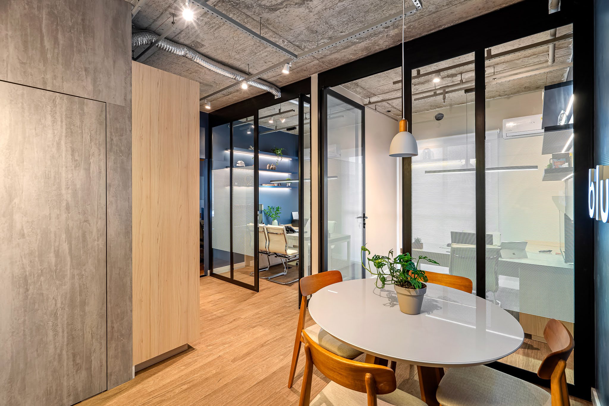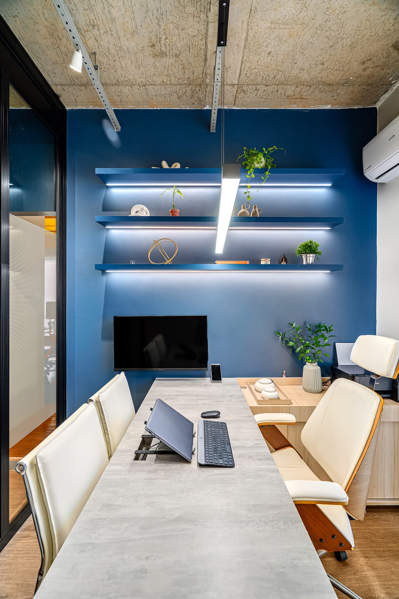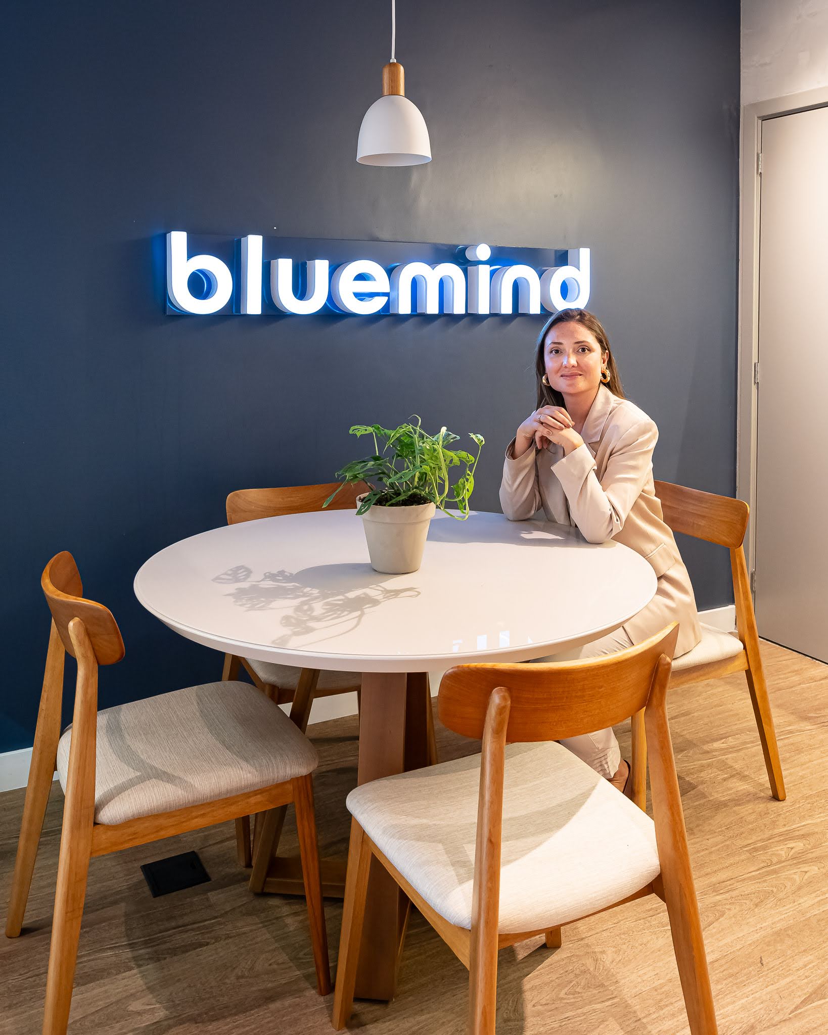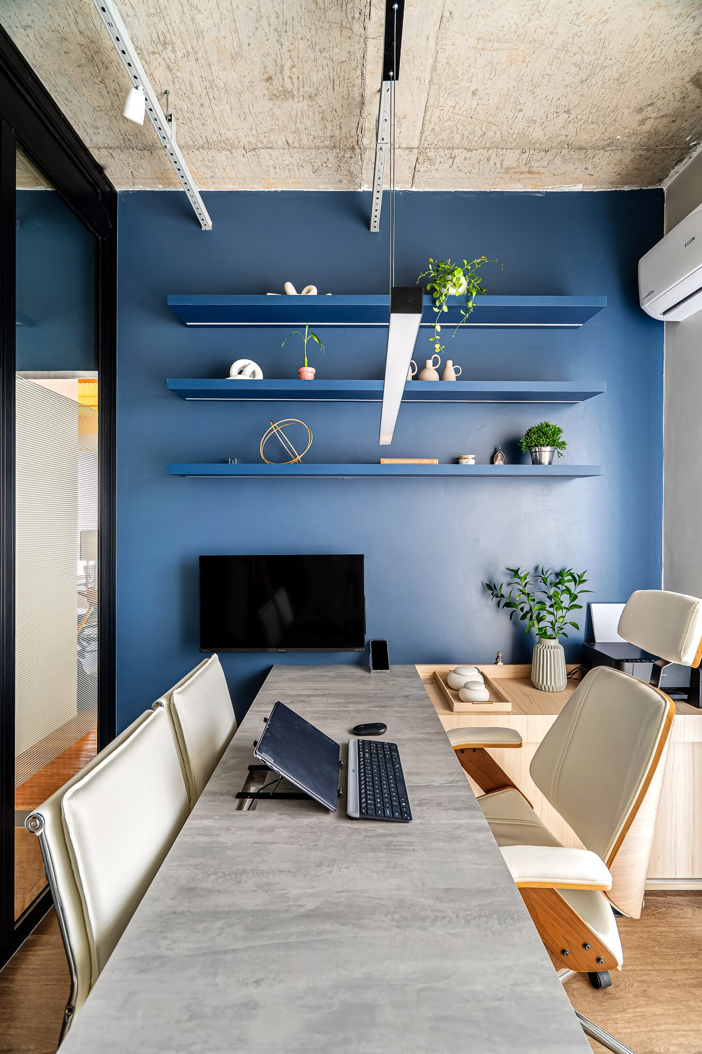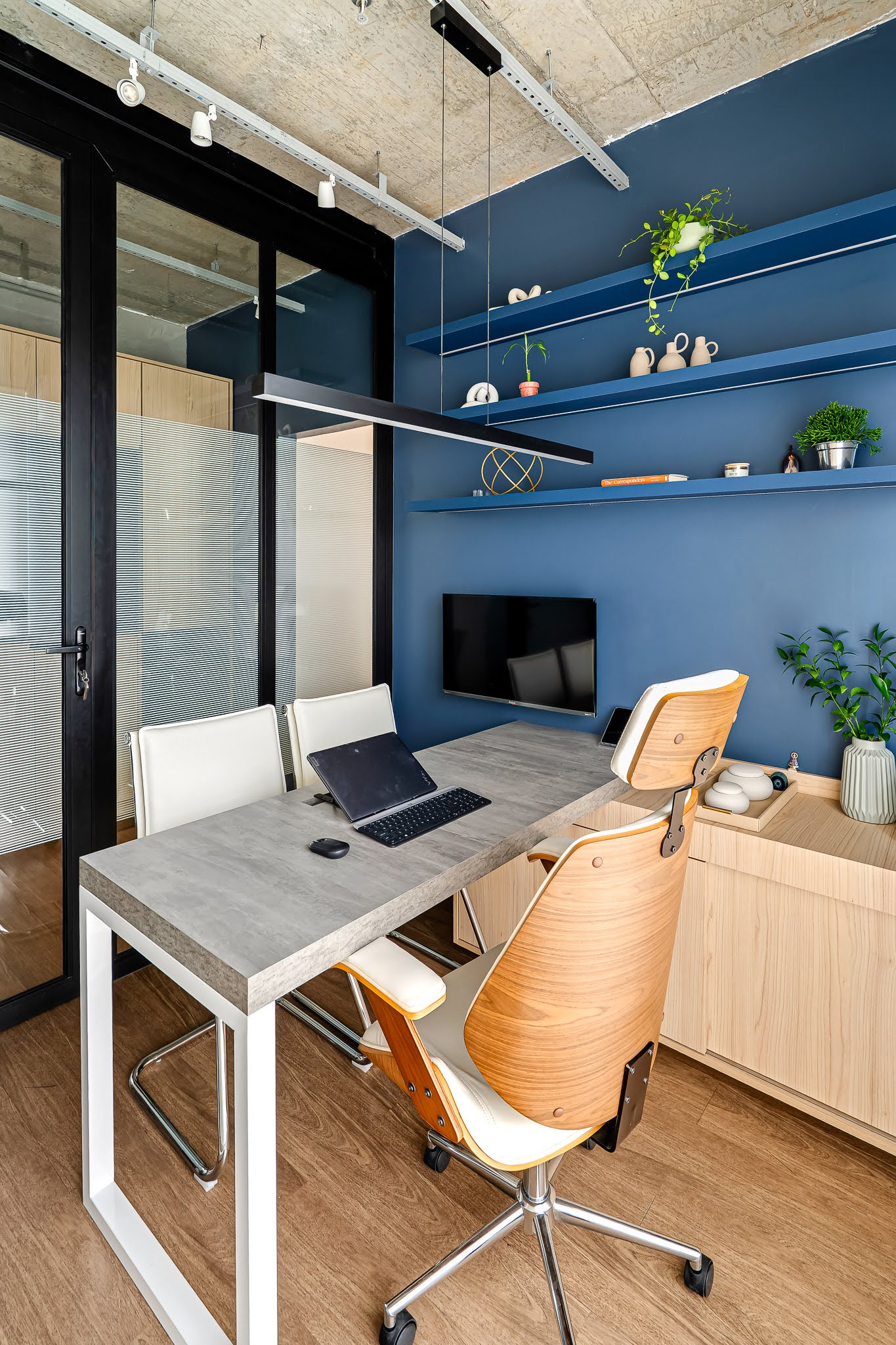 O Projeto Bluemind transforma duas salas comerciais, uma copa e um lavabo em espaços funcionais e cheios de identidade. As paredes focais no tom Azul Baleia reforçam a essência da marca, enquanto a marcenaria sob medida organiza e traz fluidez ao layout. Mesmo sendo salas alugadas, soluções inteligentes, acabamentos amadeirados e iluminação pontual criaram um ambiente acolhedor, contemporâneo e alinhado ao propósito dos sócios.
