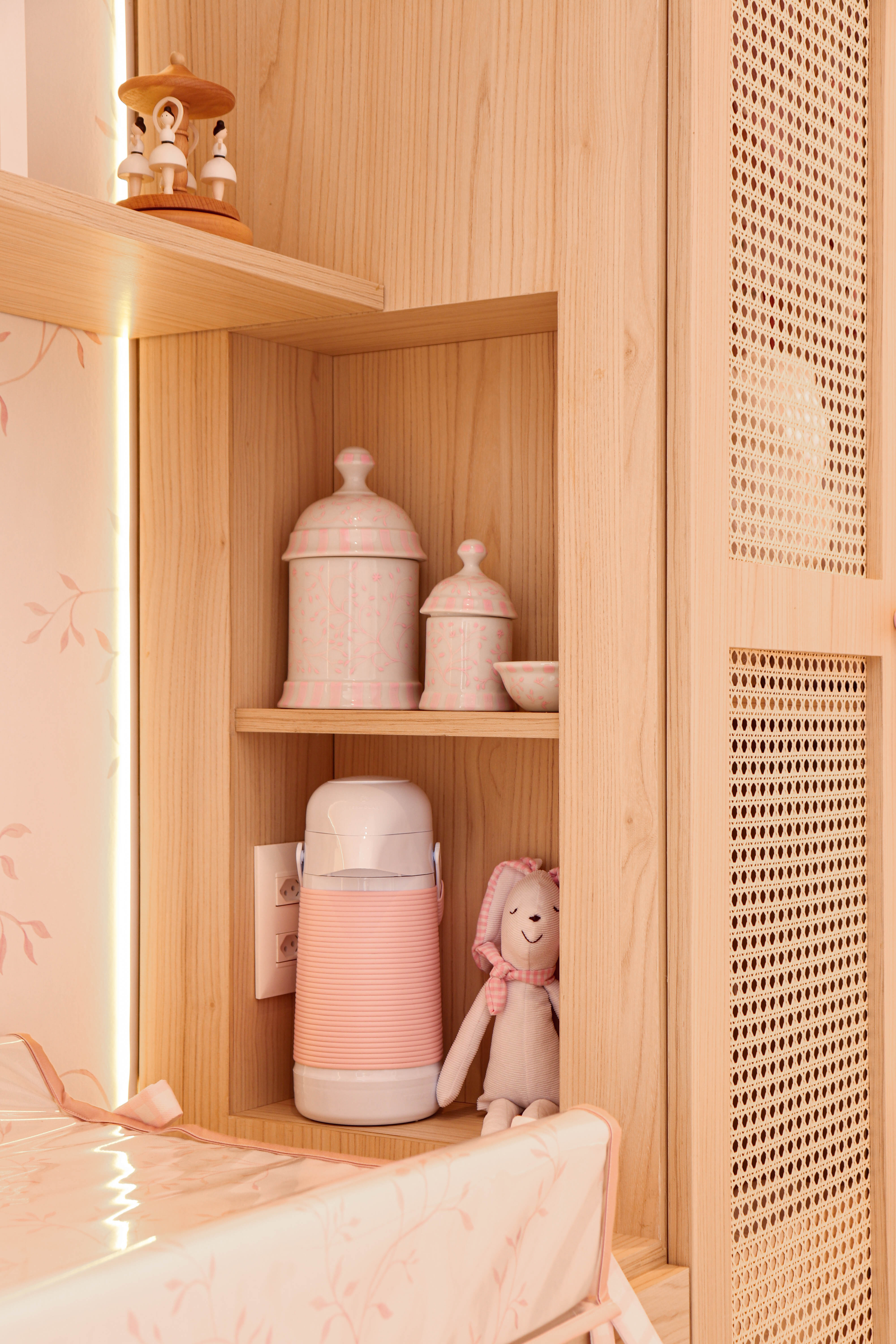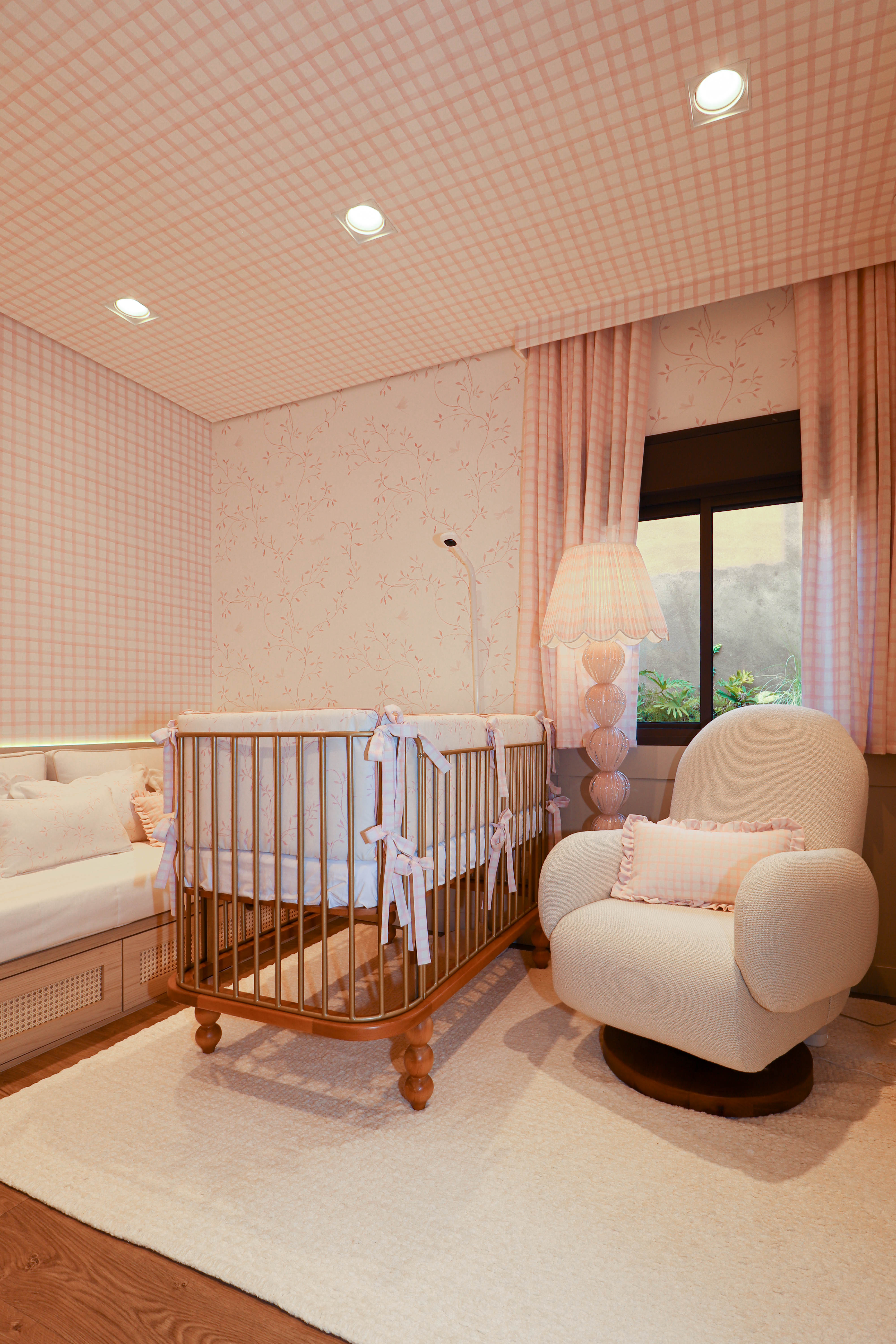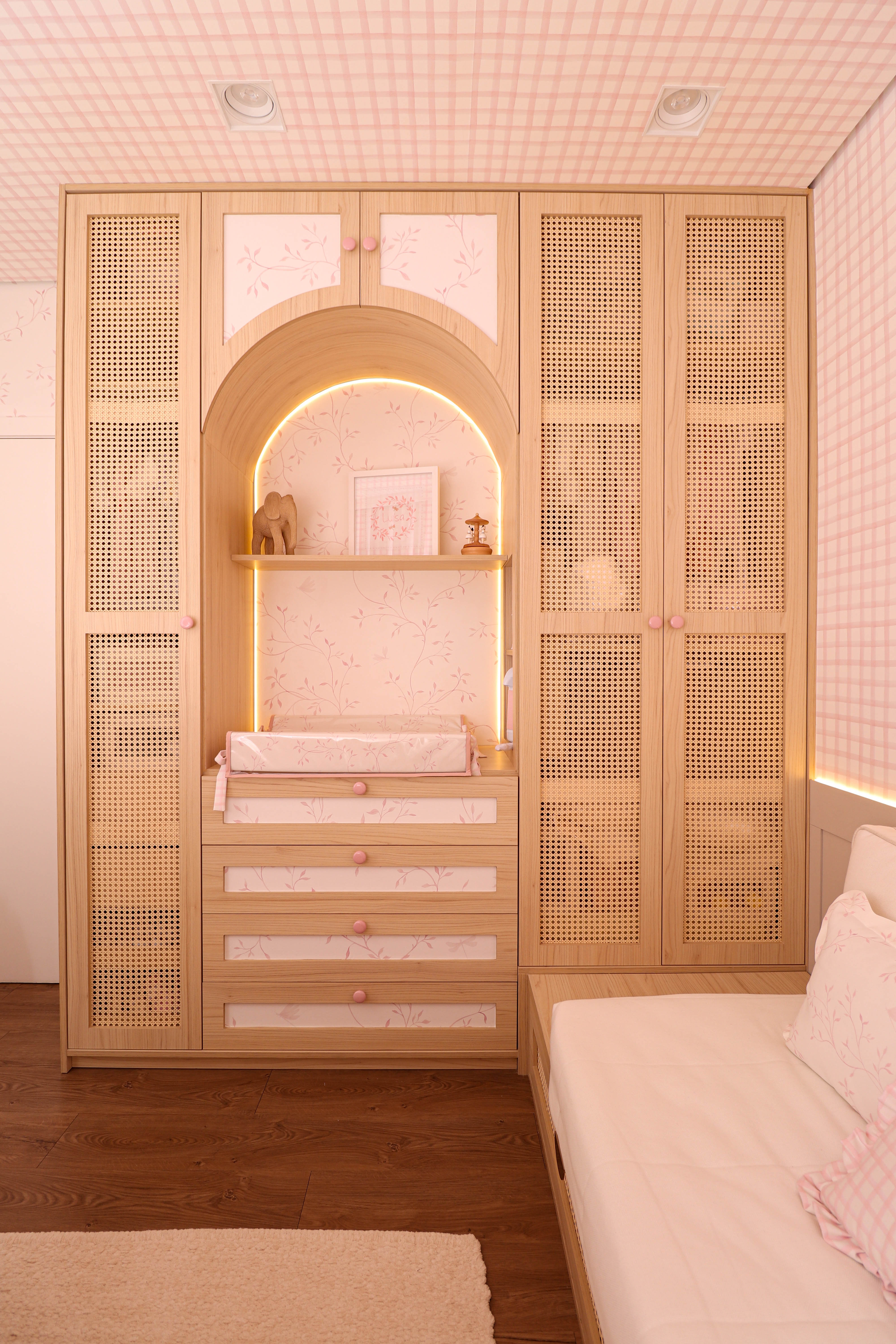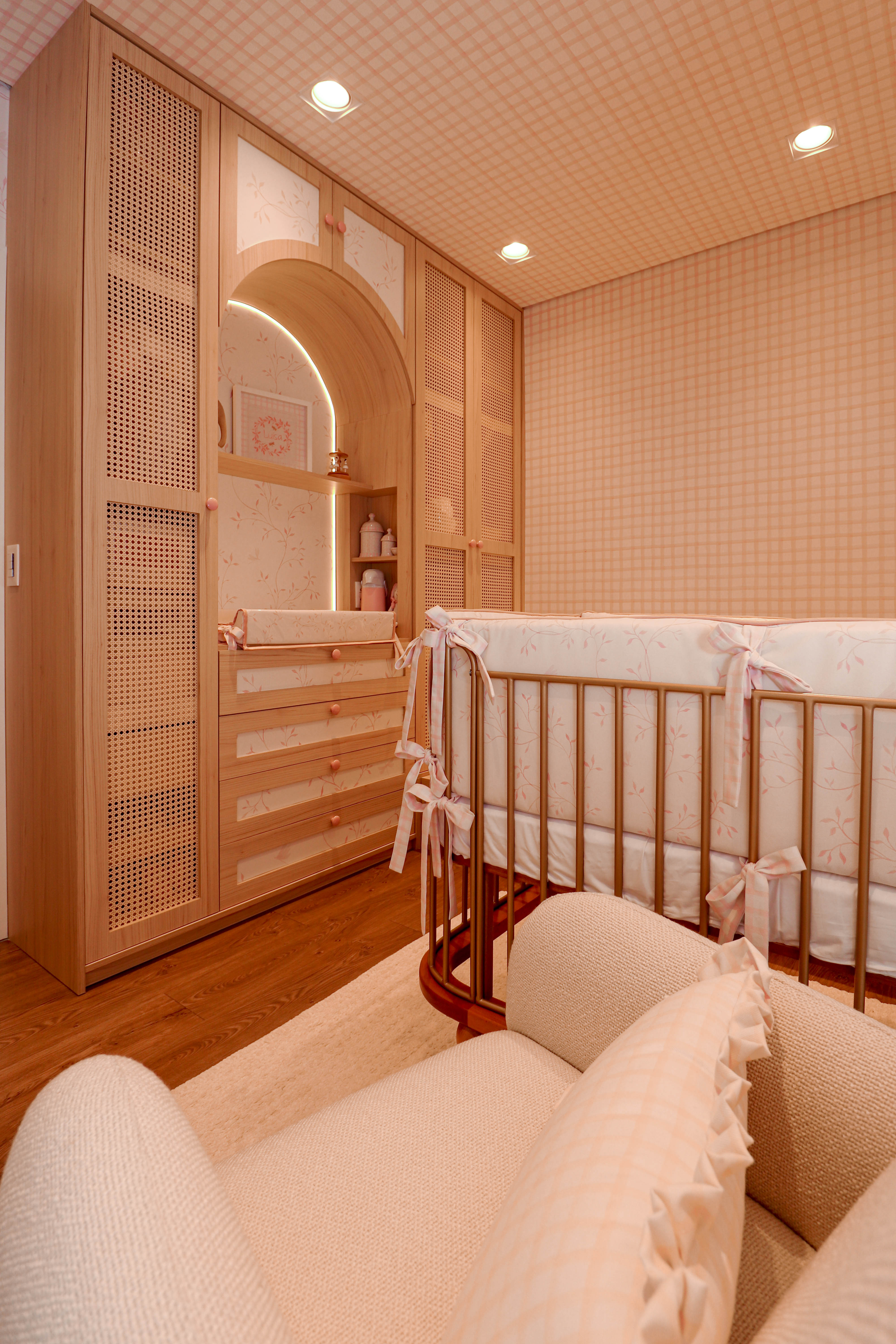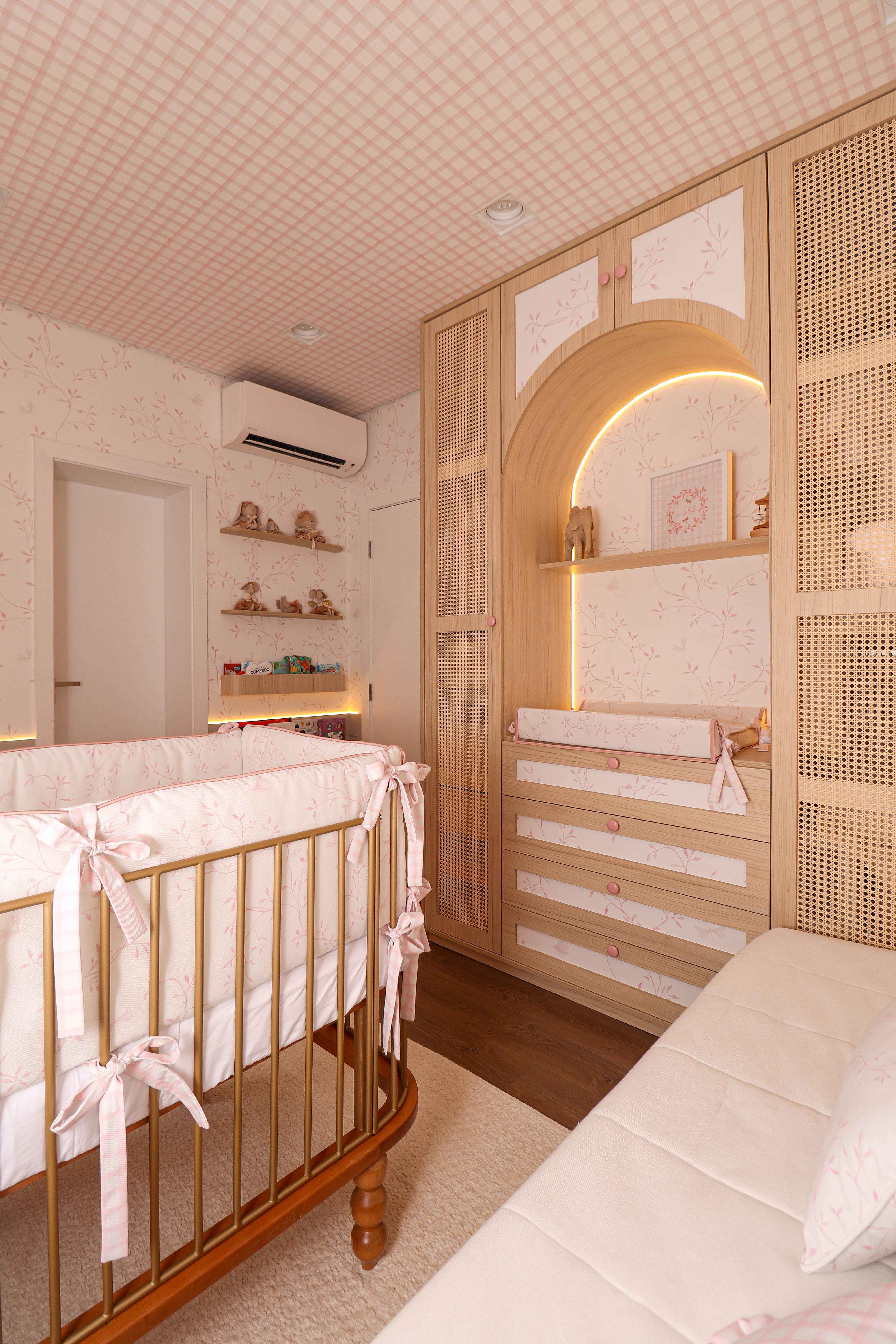 O quarto de bebê foi pensado para ser delicado, funcional e cheio de significado. O papel de parede personalizado com raminhos e xadrez rosa cria a base do ambiente, acompanhado por arcos, nichos embutidos e marcenaria detalhada com puxadores rosados e tela indiana. A iluminação em LED traz conforto, enquanto o berço, a poltrona de amamentação e a bicama com gavetões em palhinha completam um espaço acolhedor que cresce junto com a criança.