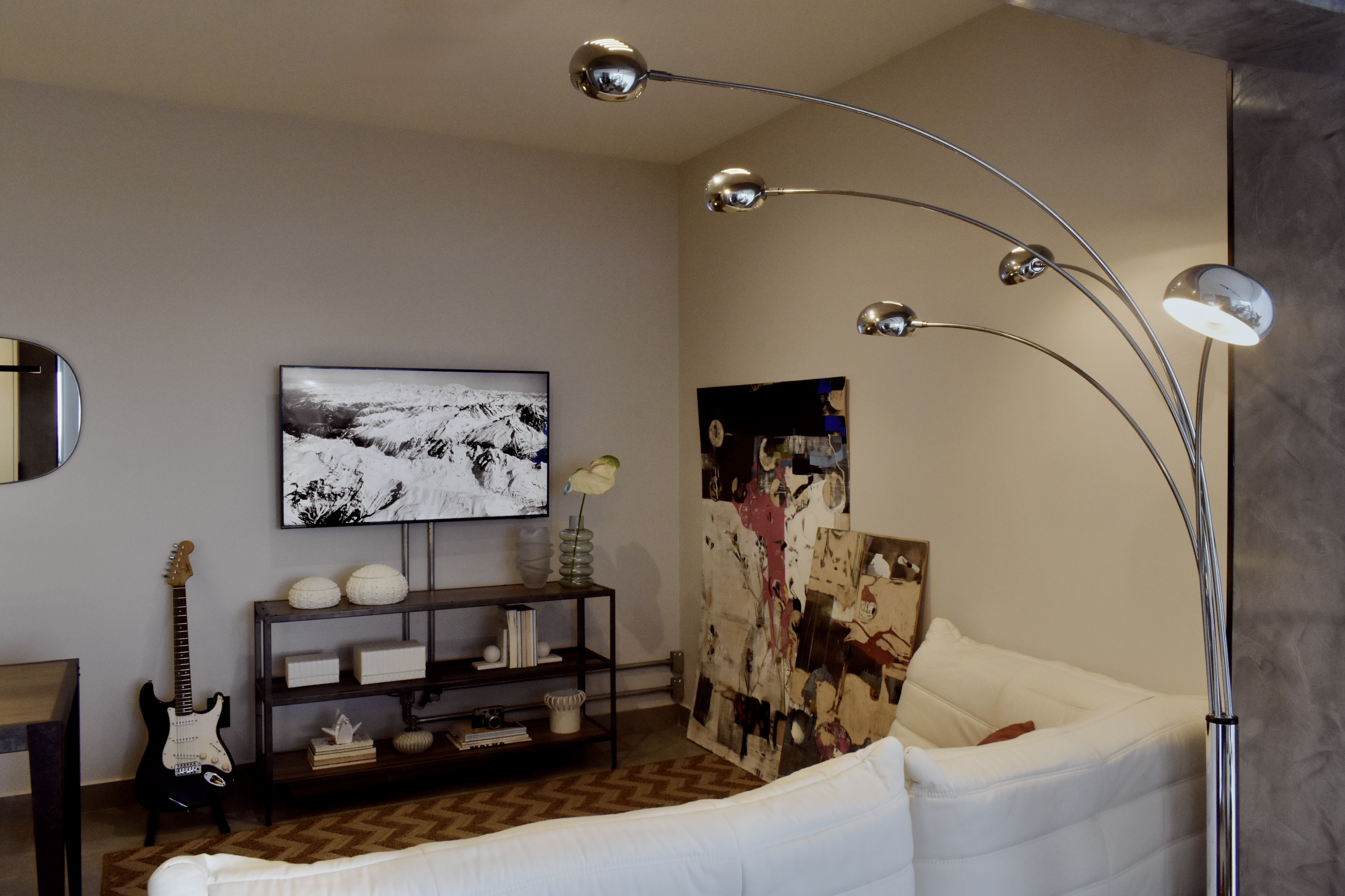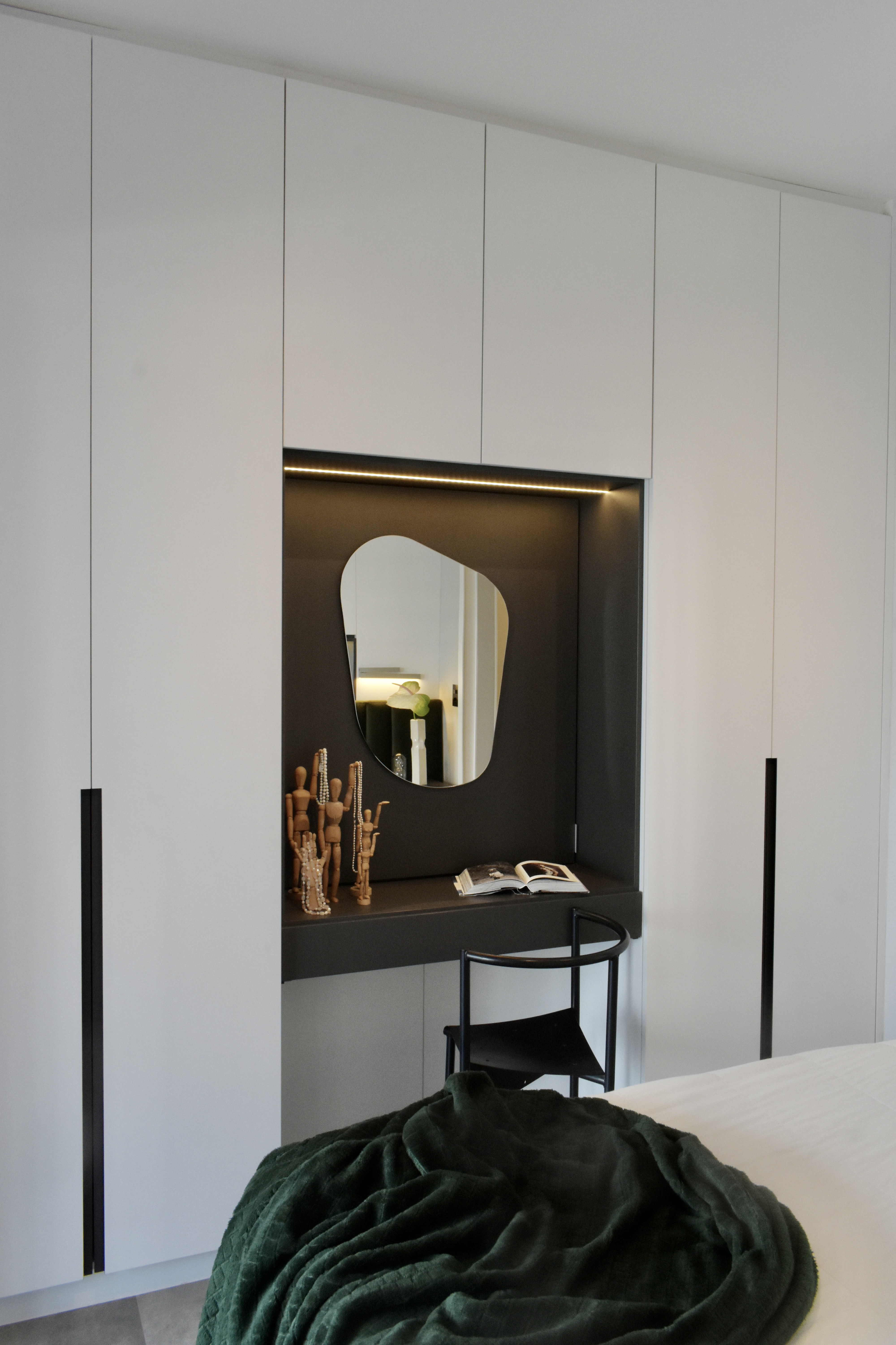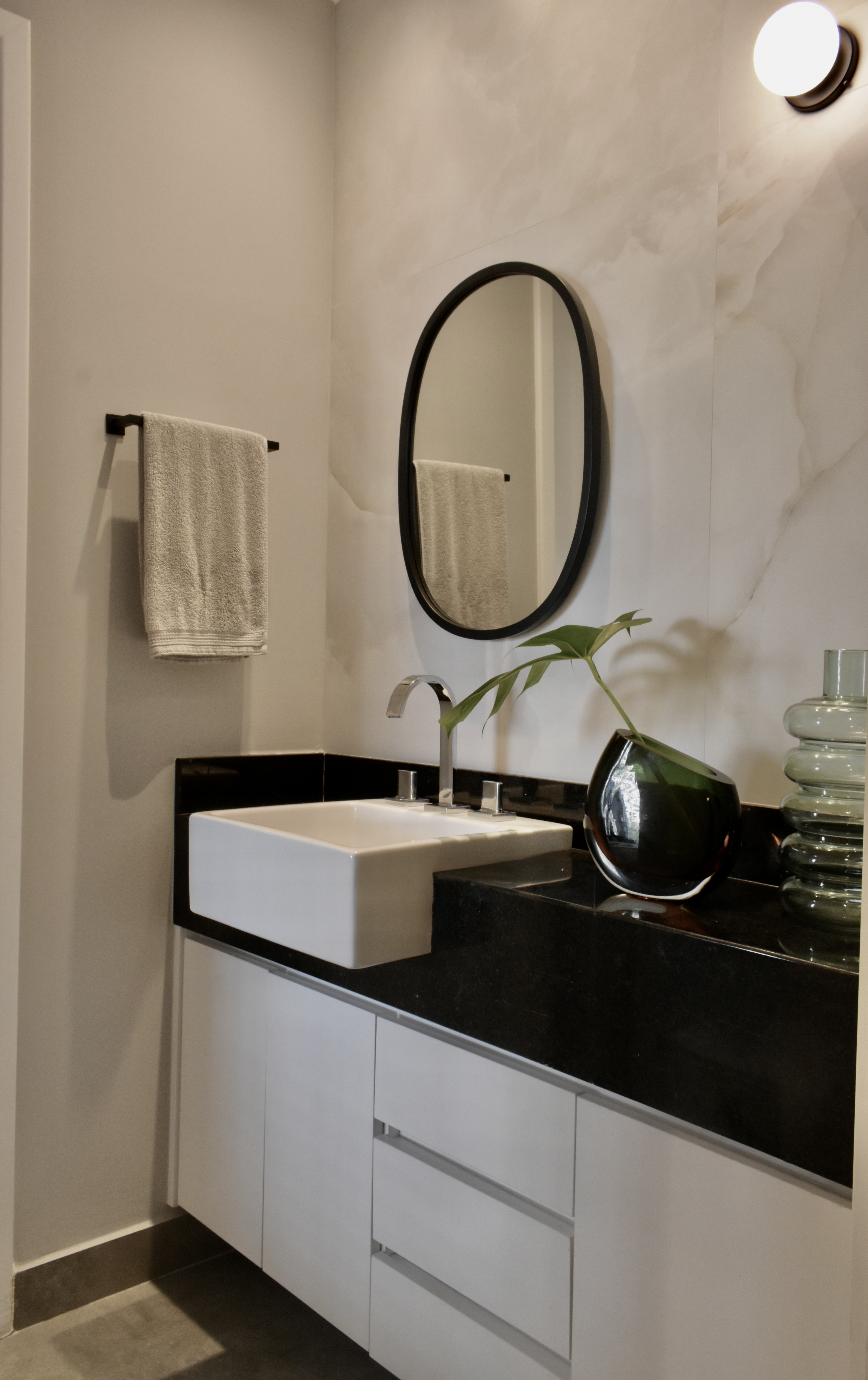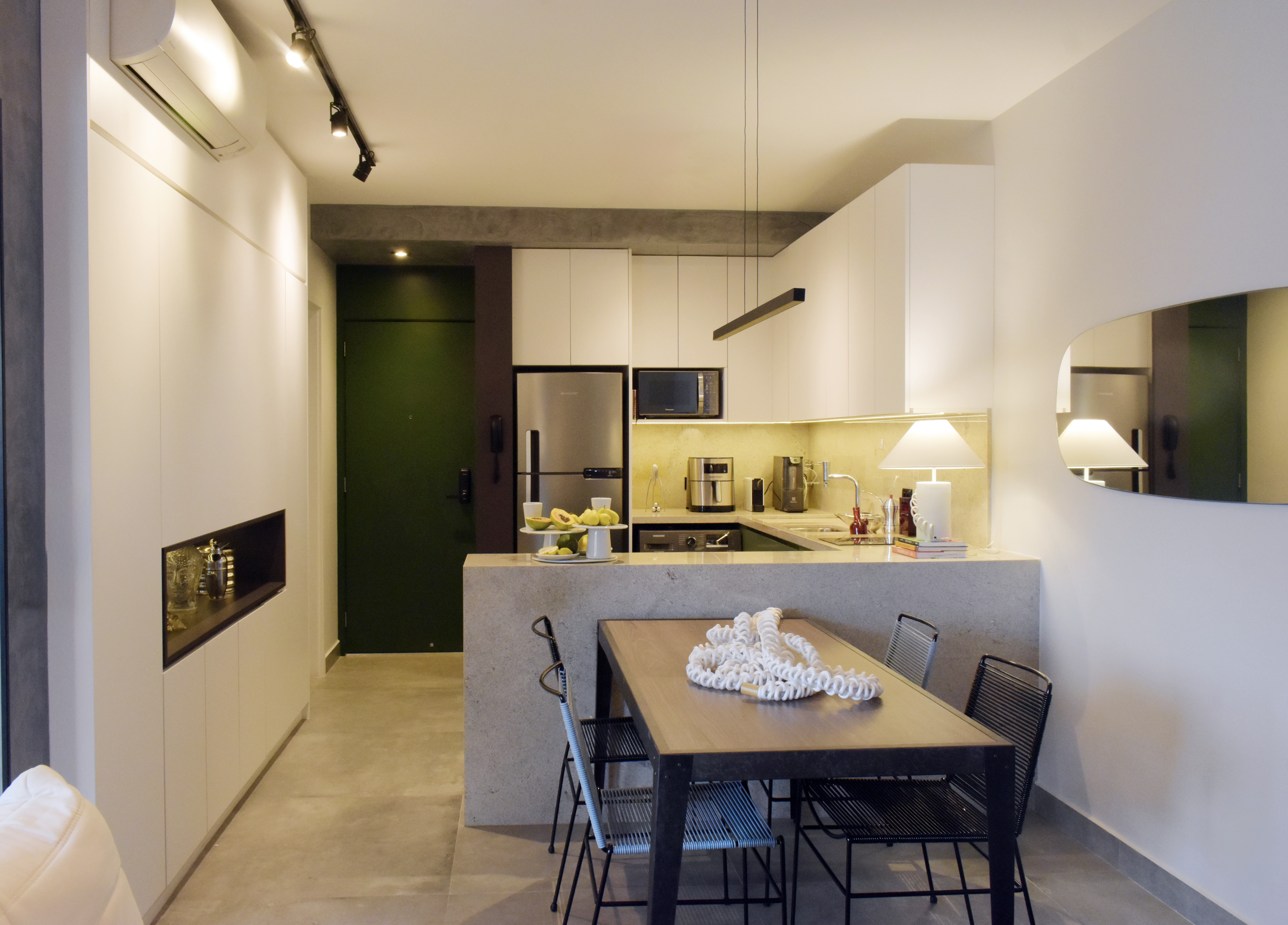 Apartamento para jovem empresária, descolada, prática e antenada. O apartamento apresenta soluções práticas, para o dia a dia, com soluções inteligentes de marcenaria. Estilo inspirado no Indusrial, com mobiliário de ferro, cores neutras como cinza, preto e branco e toques de verde escuro. Na varanda um tapete com tons quentes equilibra o espaço.