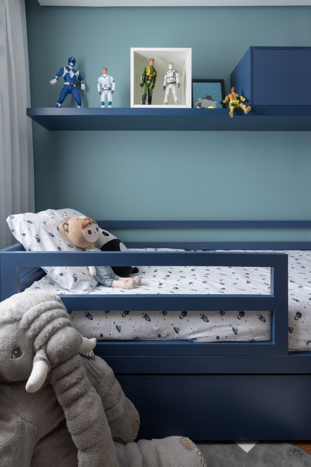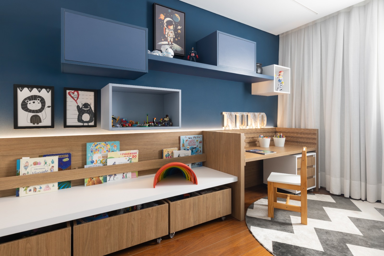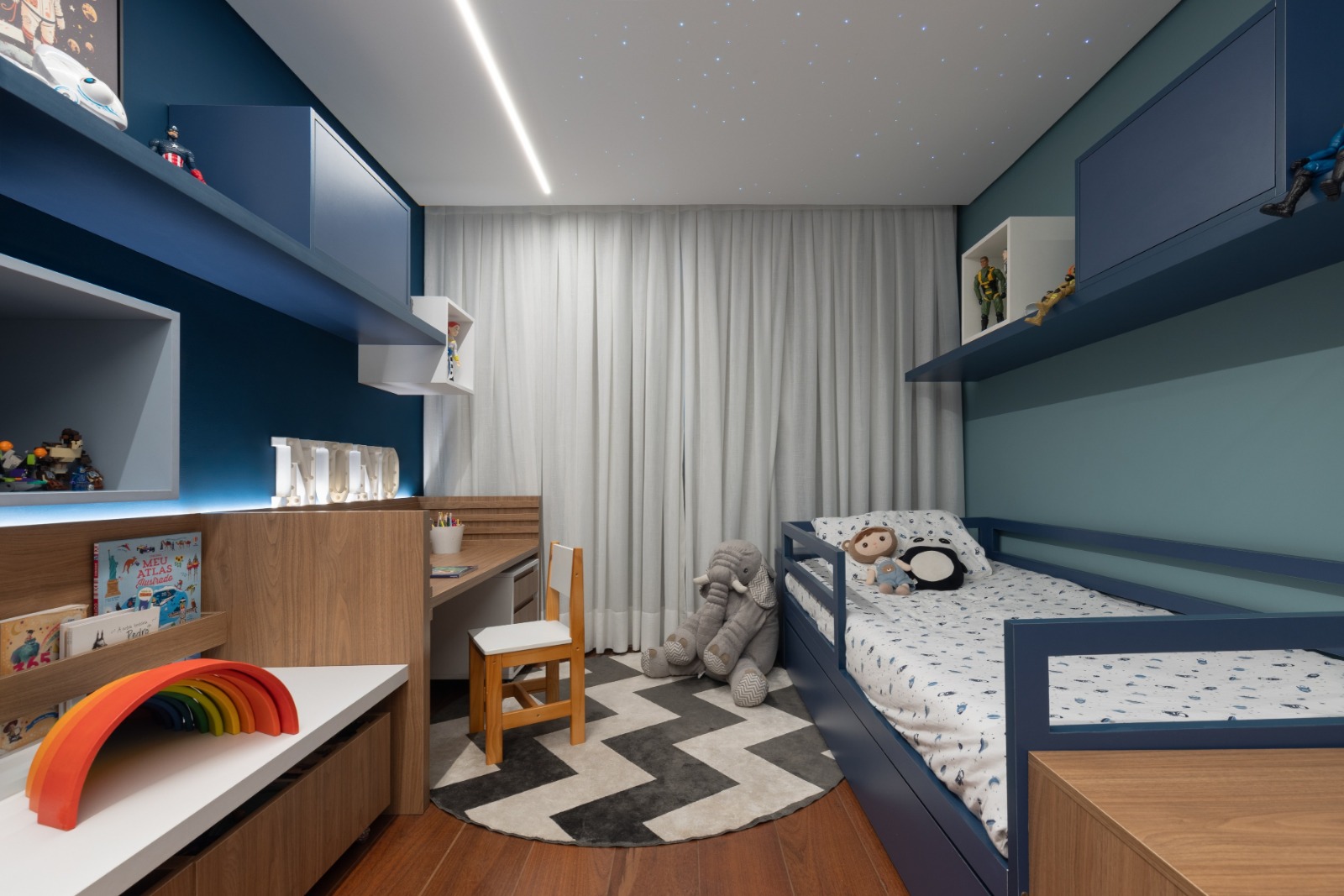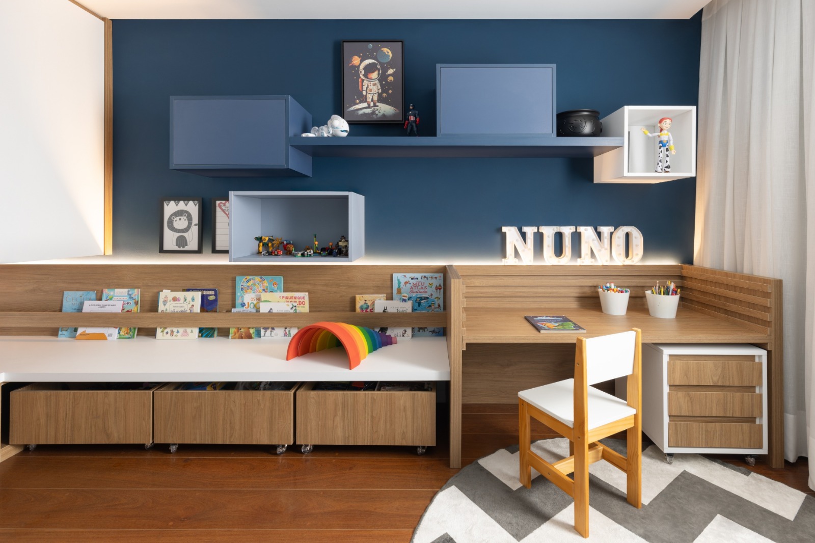 No quartinho do Nuno, atendemos ao pedido de transformar o ambiente em uma experiência que vai muito além de estudar e dormir. Aqui, a brincadeira rola solta, e a inserção na temática universo é percebida e vivenciada em cada detalhe, criando um espaço lúdico, estimulante e cheio de personalidade.