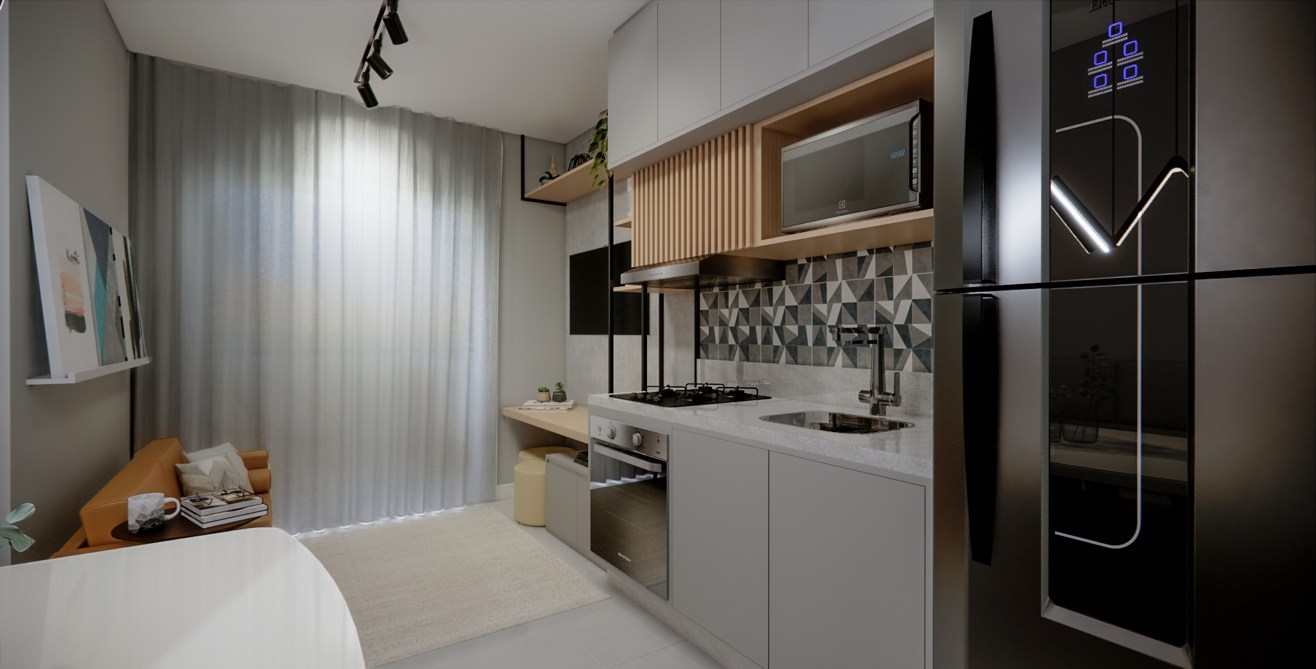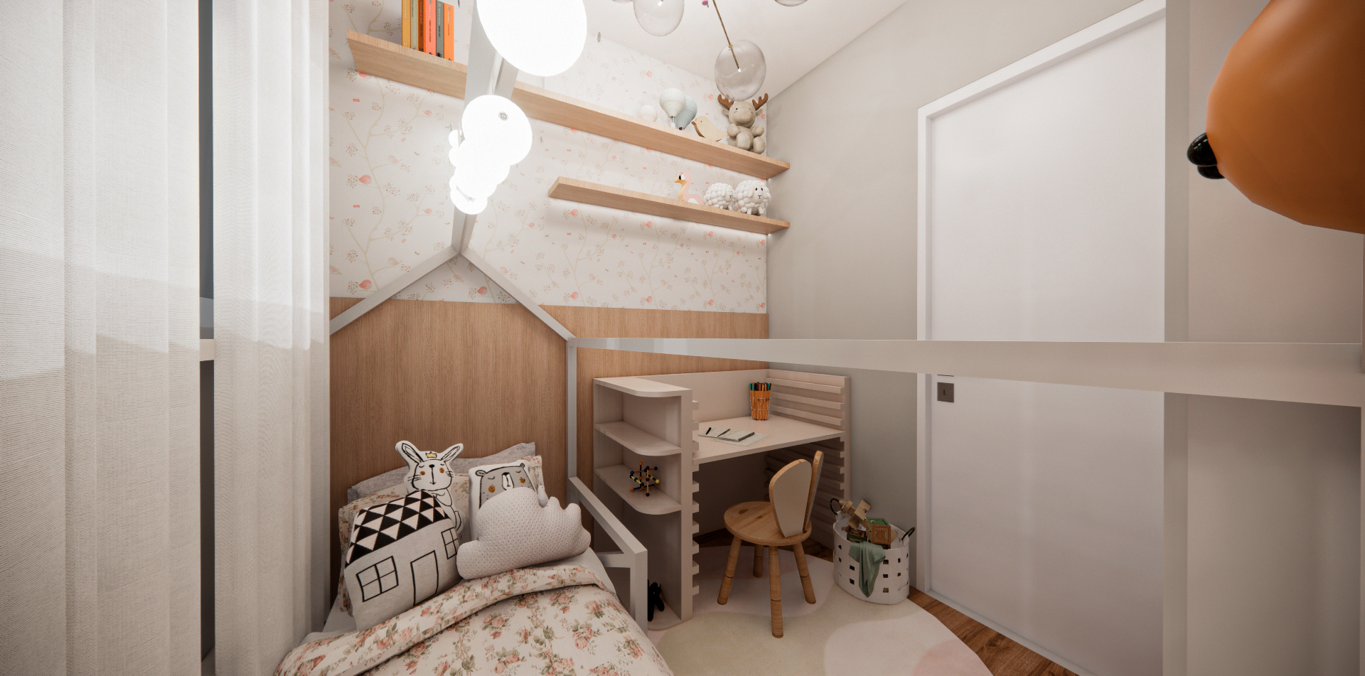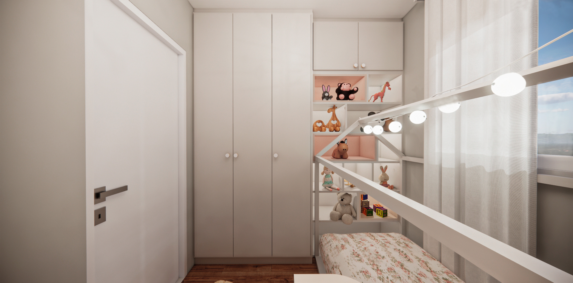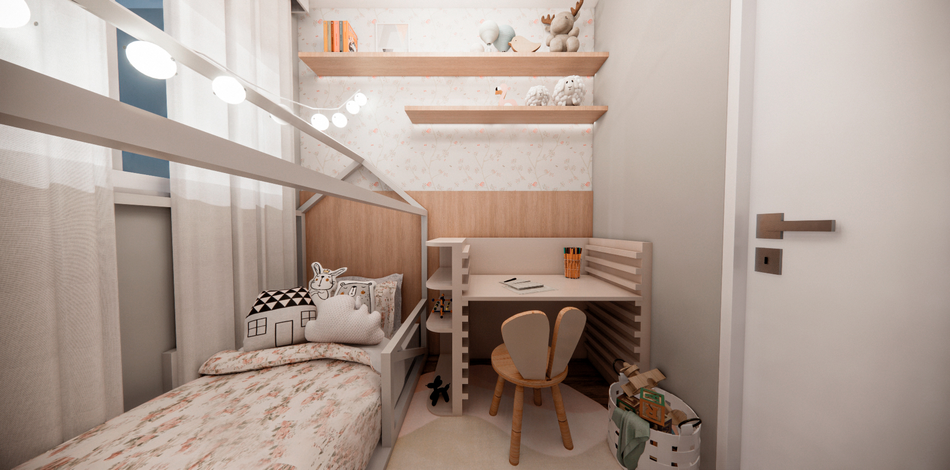 Projeto em apartamento de 49m², buscando adaptar melhor o espaço para jovem família, onde a prioridade era se adaptar ao tamanho do imóvel, buscando mais espaços de armazenamento e funcionalidade, mantendo uma estética agradável para os clientes. Possuindo também um quarto infantil, o intuito dele é que a criança consiga usá-lo de maneira independente, acessando todos os espaços.
