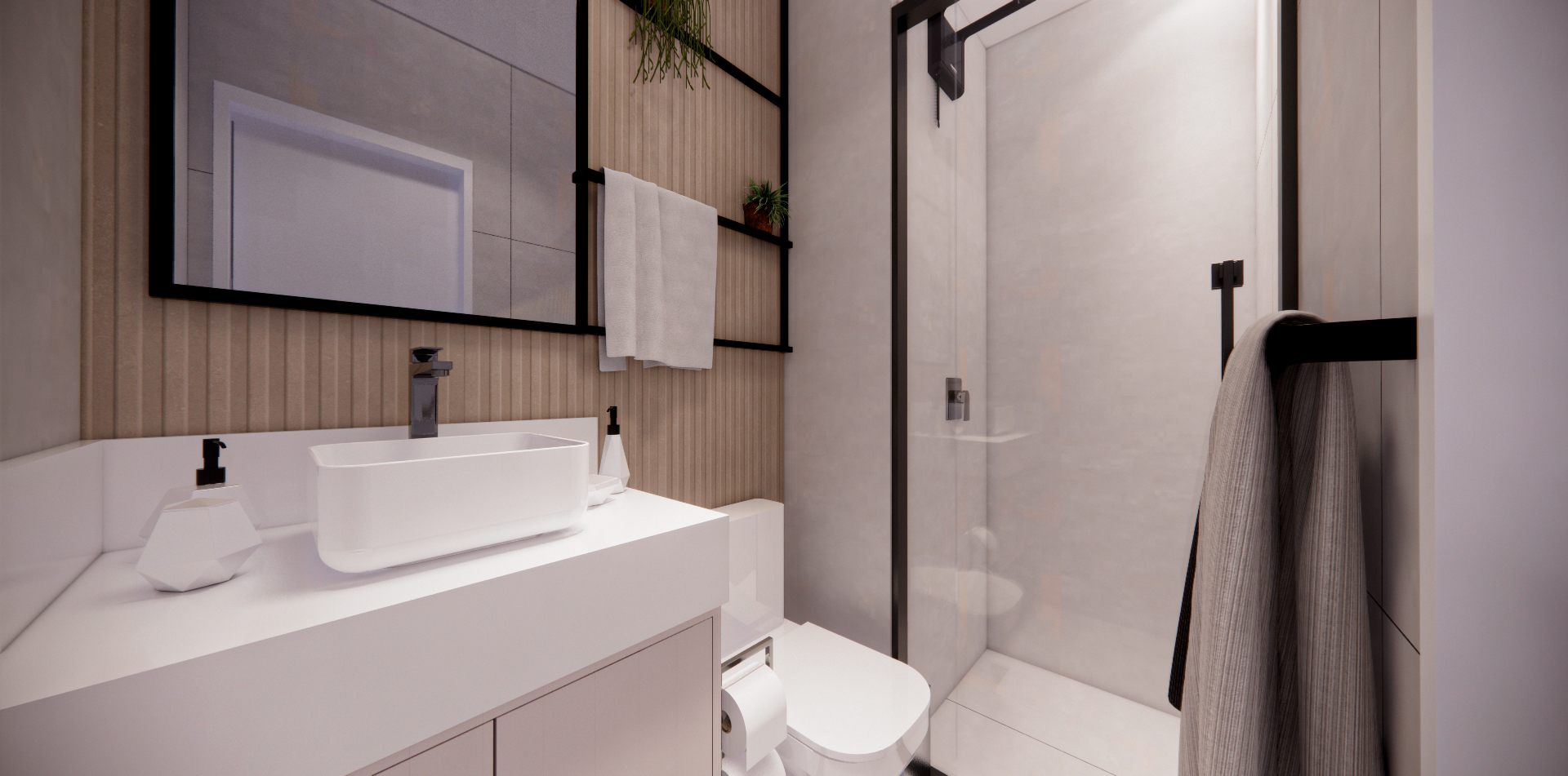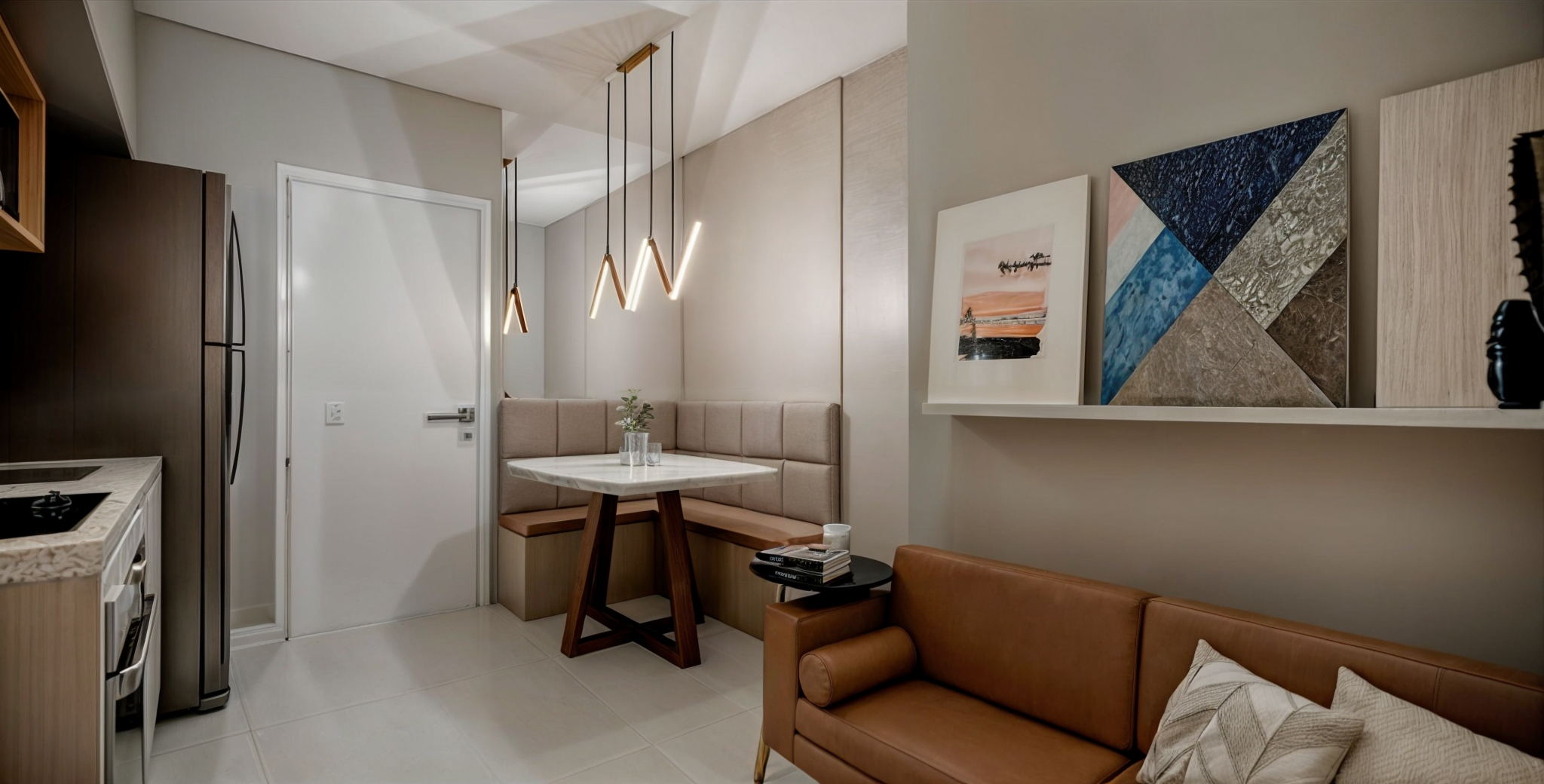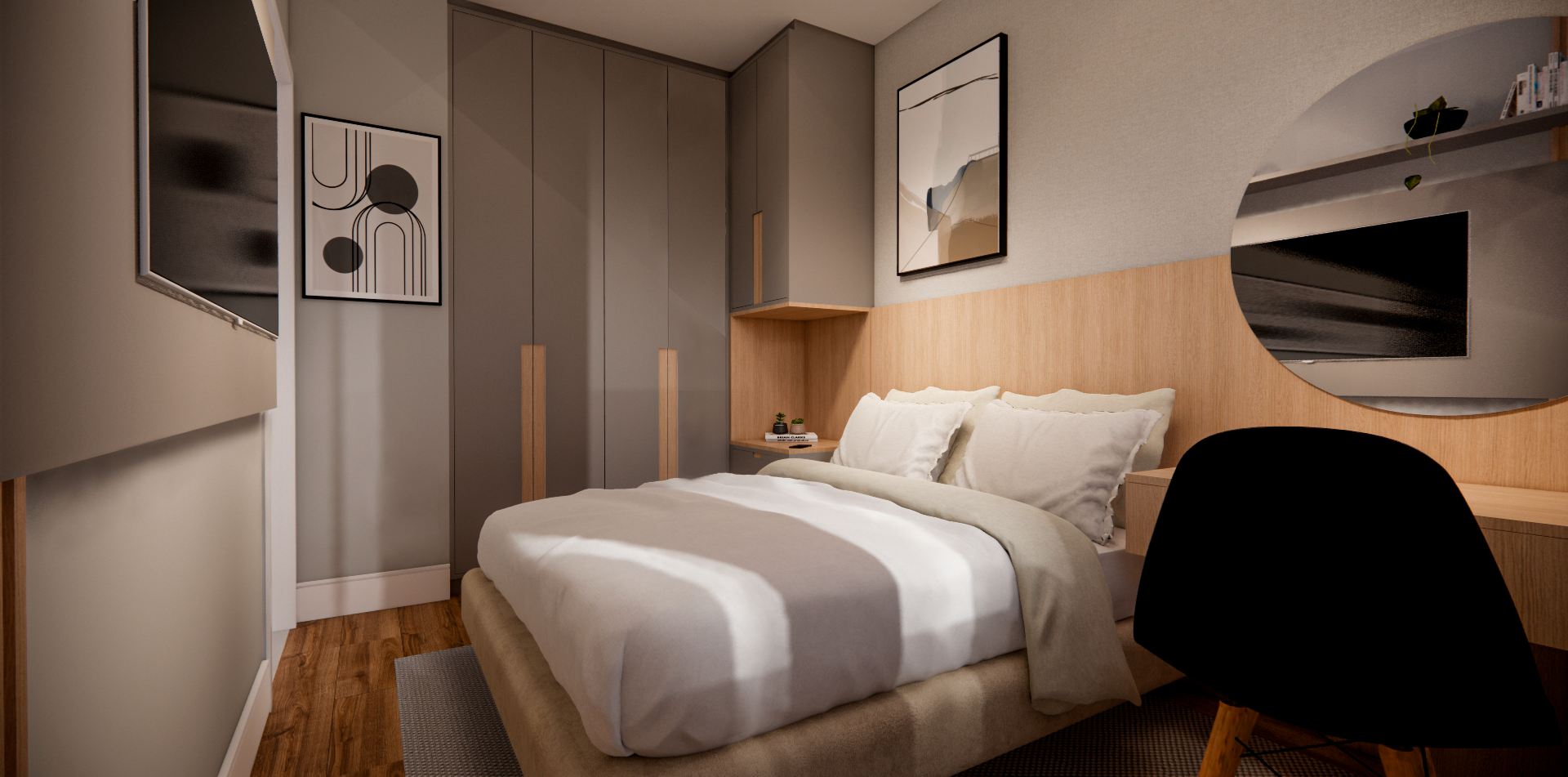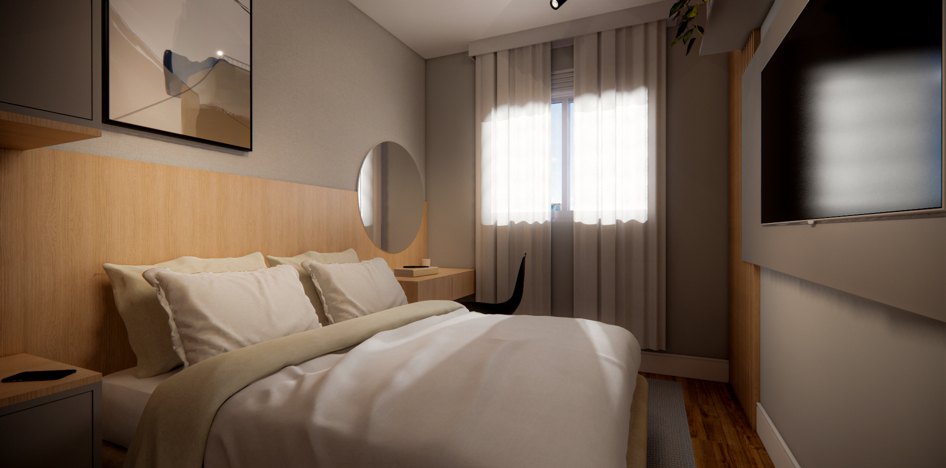 Projeto em apartamento de 49m², buscando adaptar melhor o espaço para jovem família, onde a prioridade era se adaptar ao tamanho do imóvel, buscando mais espaços de armazenamento e funcionalidade, mantendo uma estética agradável para os clientes. Possuindo também um quarto infantil, o intuito dele é que a criança consiga usá-lo de maneira independente, acessando todos os espaços.